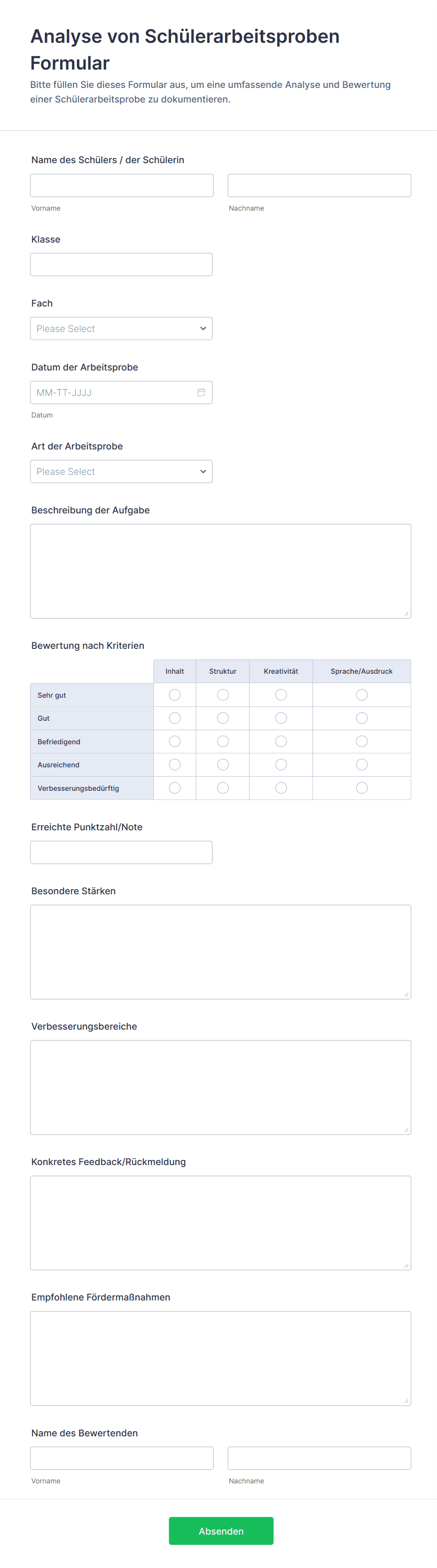Fügen Sie Freitextfelder für Feedback und einen Abschnitt für Aktionspläne hinzu, in denen Verbesserungsziele oder empfohlene Unterstützungsmaßnahmen festgehalten werden können.