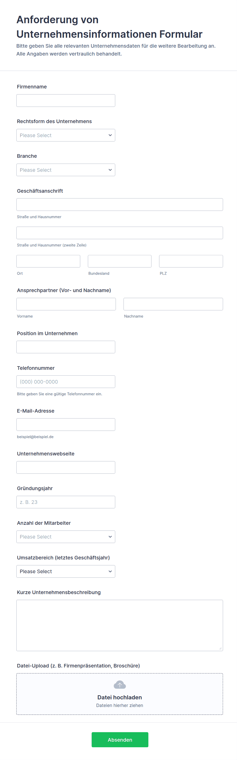 Informationsanfrageformulare sind digitale Tools zur strukturierten Erfassung wichtiger Angaben von Einzelpersonen oder Organisationen. Sie werden von Unternehmen, Bildungseinrichtungen, Gesundheitsdienstleistern, Behörden und gemeinnützigen Organisationen genutzt, um Kontaktdaten, Serviceanfragen, Feedback oder Dokumentationswünsche zu sammeln. Ob Sie Kundenanfragen bearbeiten, Support-Tickets verwalten, Forschungsdaten erfassen oder interne Anfragen koordinieren müssen — diese Formulare optimieren Ihren Workflow, indem sie eine effiziente und übersichtliche Möglichkeit bieten, eingehende Daten zu erfassen und zu organisieren.