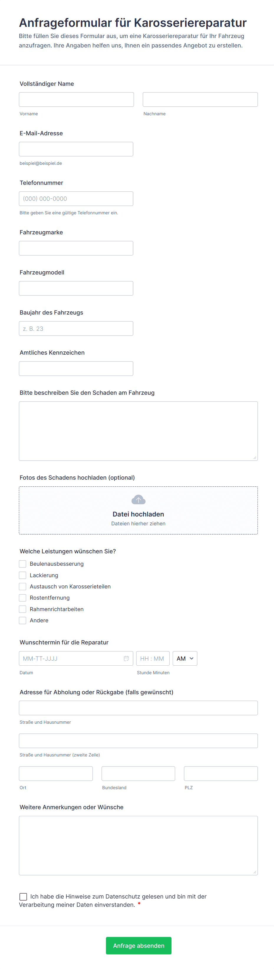 Zu den gängigen Feldern gehören Kundenkontaktdaten, Fahrzeuginformationen (Marke, Modell, Baujahr, Fahrgestellnummer), Service- oder Mietdetails, Zahlungsinformationen und digitale Signaturen.