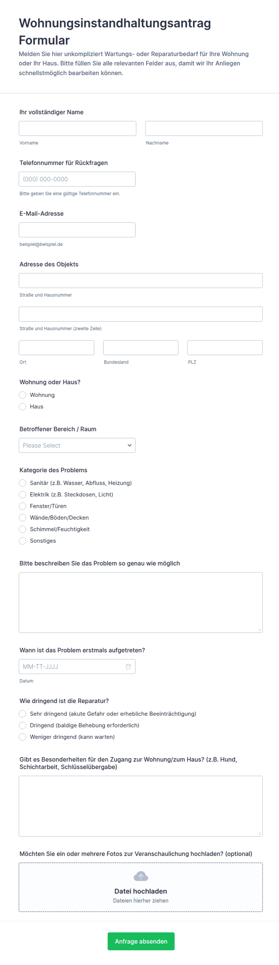 - Wartungsanfragen: Name des Mieters, Wohnungsnummer, Problembeschreibung, Dringlichkeitsstufe, Datei-Upload für Fotos.
