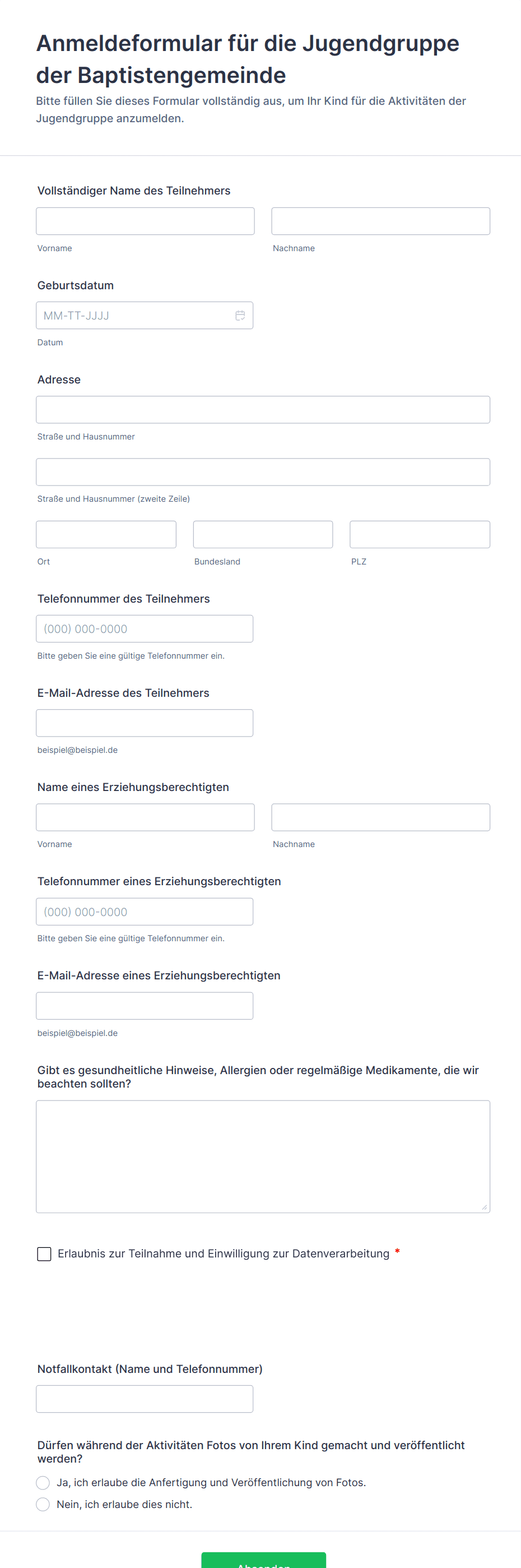 Erfassen Sie Anmeldungen für eine kirchliche Jugendgruppe mit dem Anmeldeformular FORM für die Jugendgruppe der Baptistengemeinde in Jotform und vereinfachen Sie Datenerfassung, Einwilligungen und die Organisation von Aktivitäten.