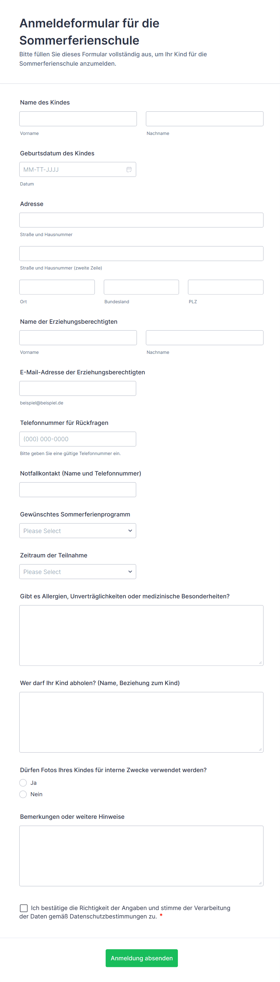 Vorlagen für Einschreibeformulare sind spezialisierte digitale Formulare, die den Prozess der Einschreibung von Studierenden in Bildungsprogramme, Kurse, Schulen oder außerschulische Aktivitäten optimieren. Diese Vorlagen werden häufig von Bildungseinrichtungen, Schulungszentren, Kinderbetreuungsanbietern und Nachhilfediensten verwendet, um wichtige Informationen von Studierenden und deren Erziehungsberechtigten zu erfassen. Typische Use Cases umfassen Neuaufnahmen von Studierenden, Kursanmeldungen, Sommercamp-Registrierungen, Anmeldungen für Nachmittagsprogramme und sogar Stipendienbewerbungen. Durch die Standardisierung des Einschreibeverfahrens tragen diese Vorlagen dazu bei, dass alle erforderlichen Daten – wie persönliche Angaben, akademischer Werdegang, Notfallkontakte und Einverständniserklärungen – effizient und sicher erfasst werden.