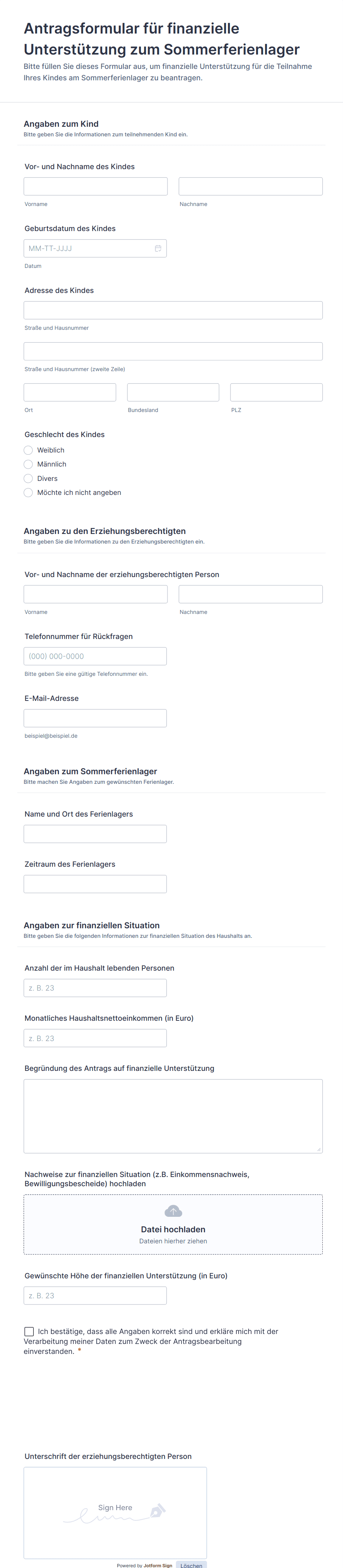 Machen Sie jeden Moment des Sommercamps unvergesslich, sogar den Schreibkram. Mit Jotform können Sie professionelle Online-Formulare entwerfen, die zukünftige Teilnehmer schon begeistern, bevor es losgeht. Welches Formular Sie auch immer benötigen - Anmeldeformulare, Anmeldungen für Betreuer, Auswertungen - wir haben für jeden Fall etwas dabei, ob Regen oder Sonnenschein, mit unserer Auswahl an vorgefertigten Templates. Nachdem Sie eine Vorlage an die spezifischen Bedürfnisse Ihres Sommercamps angepasst haben, können Sie Informationen über das Ferienlager und die Betreuer, Kontaktnummern für Notfälle, medizinische Vorgeschichte, Ernährungsgewohnheiten und sogar Zahlungen online erfassen. Die Planung von perfekten Ferien war noch nie einfacher.