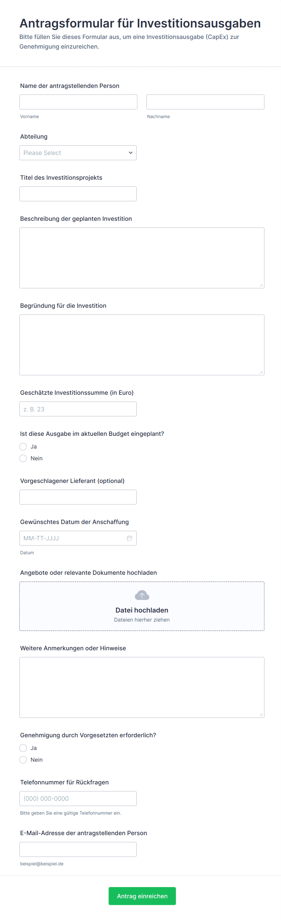 Eine Genehmigungsformularvorlage ist ein vorgefertigtes Online-Formular, das den Prozess der Einreichung, Überprüfung und Genehmigung von Anfragen innerhalb eines Unternehmens erleichtert. Es standardisiert den Workflow und stellt sicher, dass alle erforderlichen Informationen erfasst und an die richtigen Personen weitergeleitet werden.