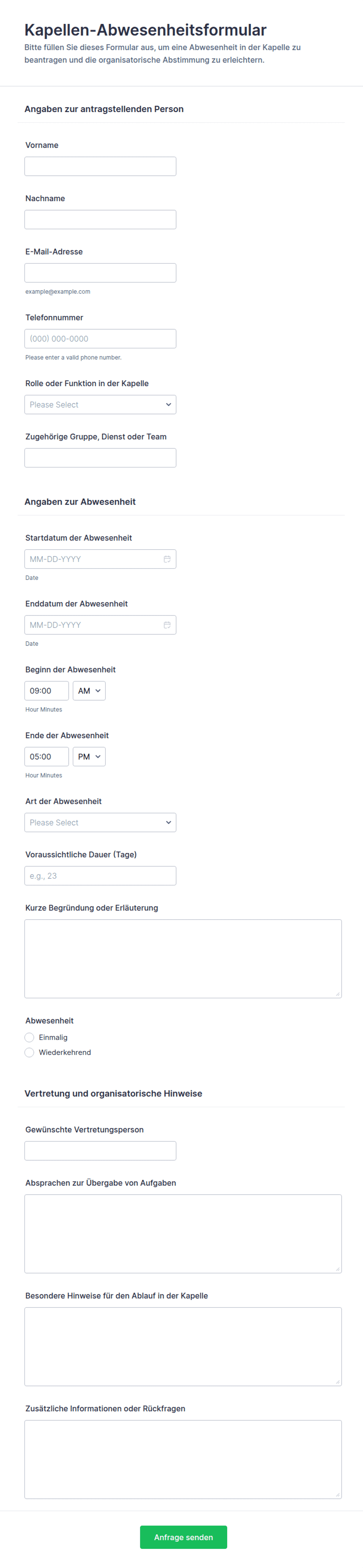 Ein Anwesenheitsformular ist ein digitales oder papierbasiertes Tool, das verwendet wird, um die Anwesenheit oder Abwesenheit von Personen bei einer Veranstaltung, einem Kurs, einem Meeting oder am Arbeitsplatz zu erfassen.