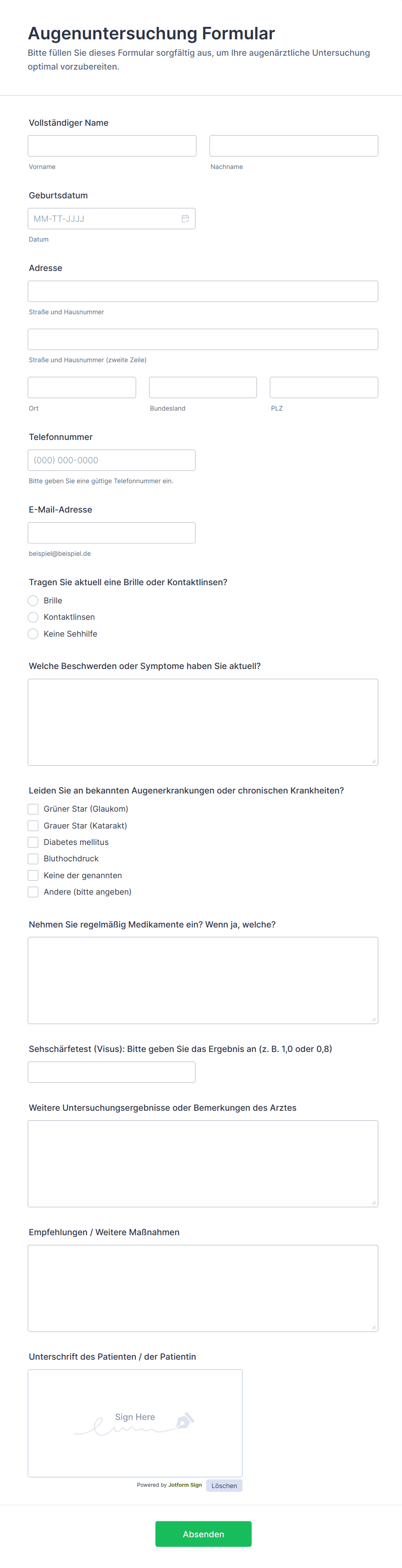 Unsere umfangreiche Auswahl an Online-Formularvorlagen im Gesundheitswesen vereinfacht das Registrierungsverfahren für neue Patienten sowie die Erfassung ihrer Patientenakte. Der Online-Formulargenerator von Jotform bietet Ärzten eine Vielzahl von Widgets, Anwendungen und Designs, um die Patienteneinbindung zu optimieren und die Kommunikation zwischen Patienten und Anbietern zu verbessern. Dies trägt dazu bei, Patienten und ihre individuellen Bedürfnisse besser zu verstehen und eine effektivere Behandlung zu gewährleisten.
