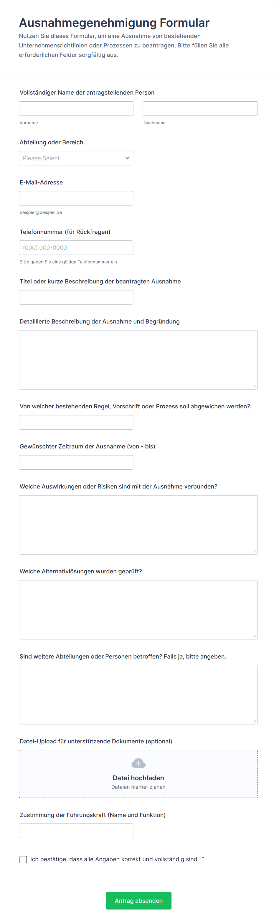 Ein Antragsformular ist ein strukturiertes Dokument oder Online-Formular, das dazu dient, Informationen von Personen zu erfassen, die eine Dienstleistung, eine Ressource, eine Genehmigung oder Support beantragen möchten. Es standardisiert die Art und Weise, wie Anträge eingereicht und verwaltet werden.