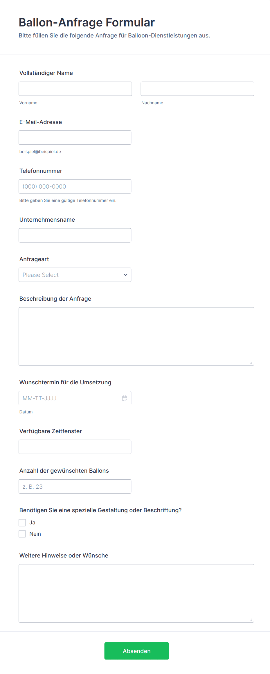 - Interne Veranstaltungsanfrageformulare erfassen den Zweck der Veranstaltung, bevorzugte Termine, die erwartete Teilnehmerzahl, den Budgetrahmen und die erforderlichen Genehmigungen.