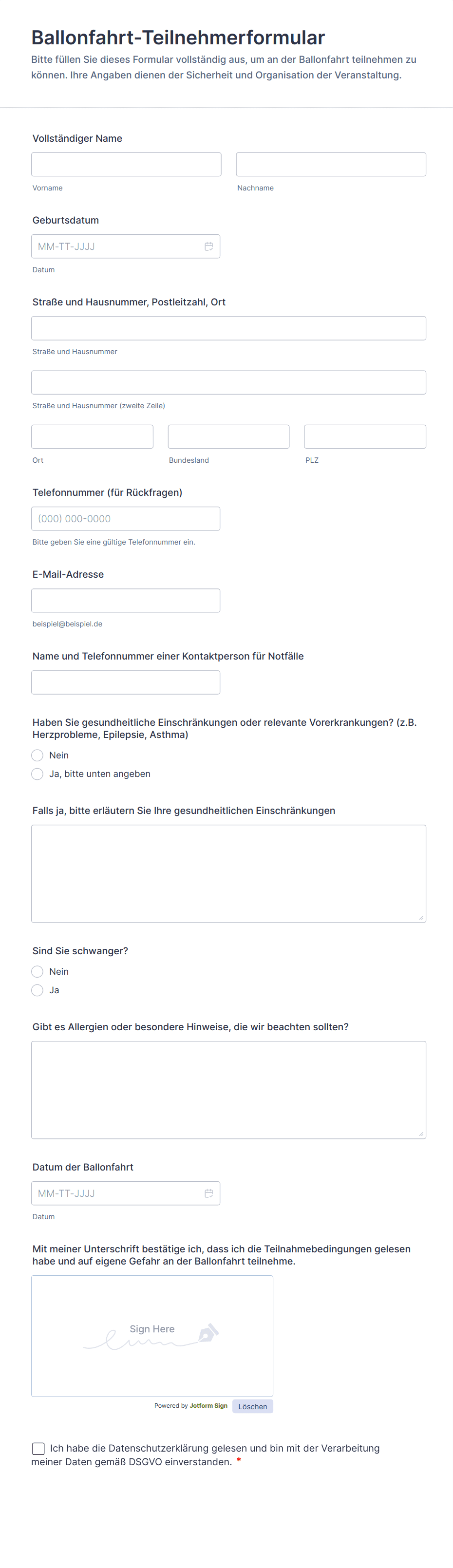 Die Formularvorlagen hier dienen nur zu Informationszwecken. Jotform bietet keine Rechts-, Finanz- oder sonstige Beratung an und impliziert nicht, dass die Formulare in allen oder bestimmten Rechtsordnungen rechtsgültig sind. Bevor Sie ein solches Formular verwenden, konsultieren Sie einen Anwalt und/oder andere zuständige Fachleute, um sicherzustellen, dass das Formular Ihren Anforderungen entspricht, rechtlich und anderweitig.