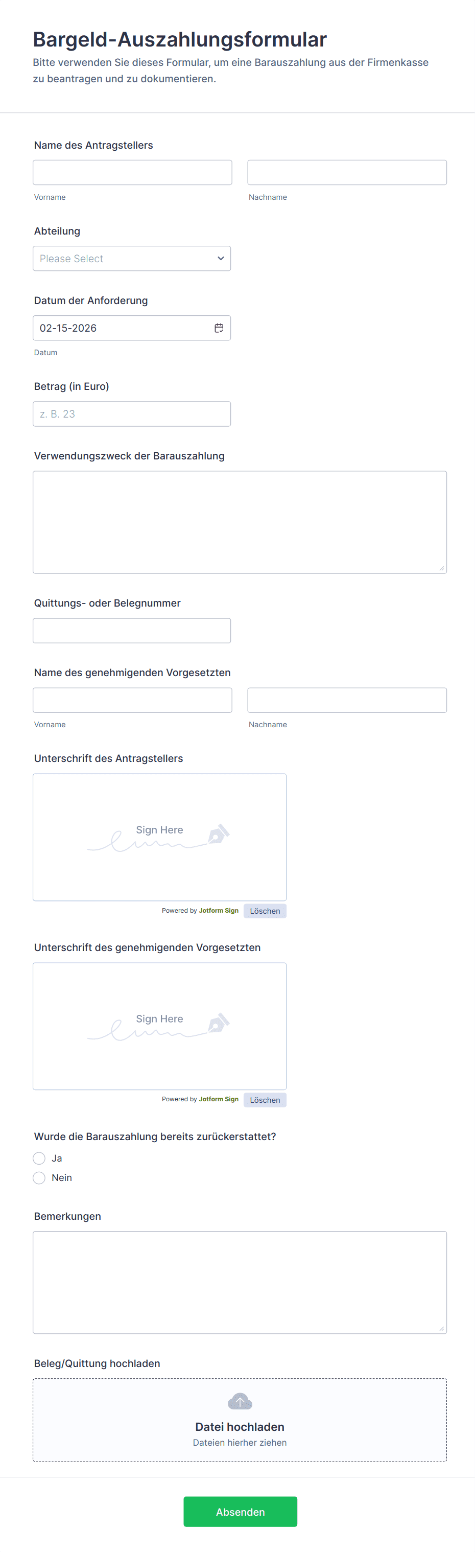 Das Bargeld-Auszahlungsformular erleichtert die interne Datenerfassung für Barauszahlungsanträge, Genehmigungen und Belegverwaltung und eignet sich für Buchhaltung, Büromanagement und Teamleitungen in Unternehmen.