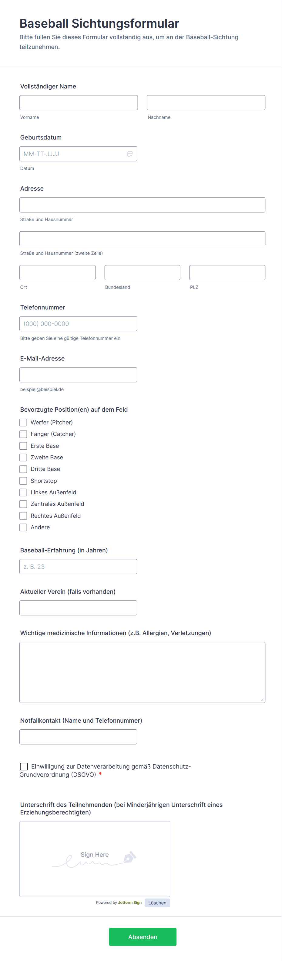 Das Baseball-Sichtungsformular unterstützt Vereine und Trainerteams bei der Datenerfassung für Tryouts und Probetrainings, damit Anmeldungen zentral eingehen und sich Teilnehmende vorab übersichtlich vergleichen lassen.