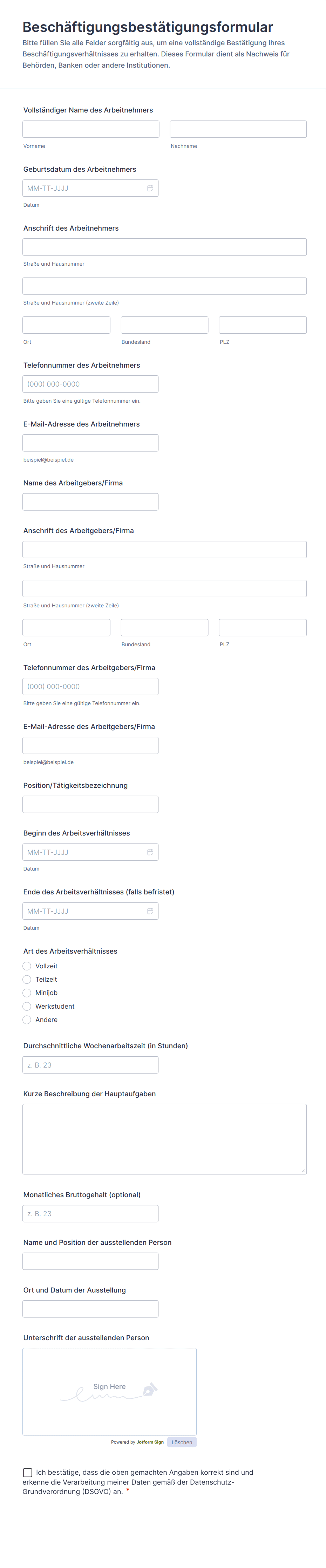 - Beschäftigungsnachweis: Personalabteilungen und Personaldienstleister nutzen diese Formulare, um den Beschäftigungsverlauf oder aktuellen Status eines Kandidaten zu überprüfen.