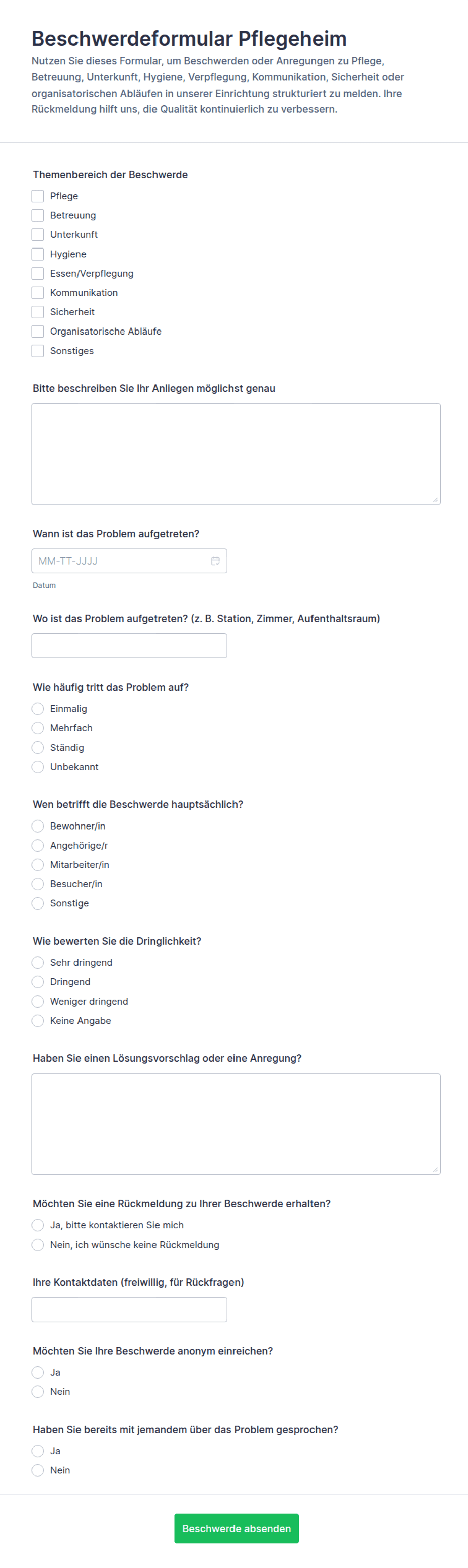 - Bedingte Logik: Bestimmte Felder werden nur angezeigt, wenn bestimmte Optionen ausgewählt werden (z. B. Art der Beschwerde).