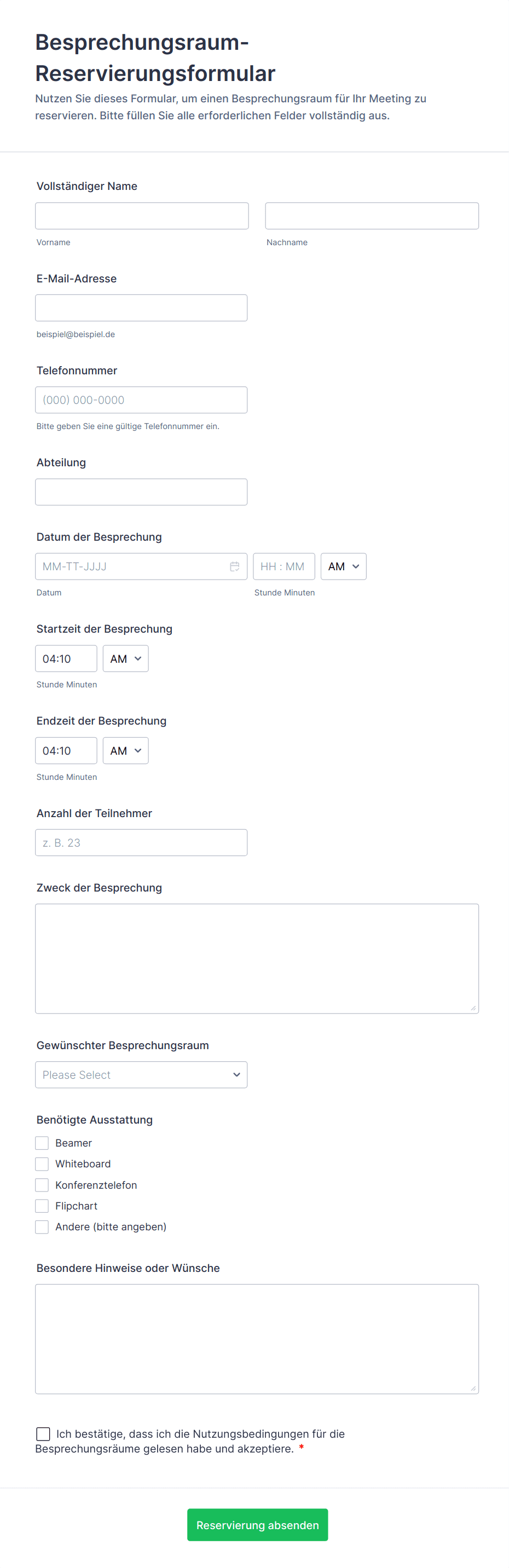 Reservierungsformulare sind digitale Tools, die den Prozess der Buchung oder Reservierung von Dienstleistungen, Räumen oder Artikeln optimieren. Unternehmen und Organisationen nutzen sie häufig, um Termine, Event-Anmeldungen, Tischreservierungen, Raumvermietungen, Hotelaufenthalte, Ausrüstungsverleih und vieles mehr zu verwalten. Durch die Erfassung wichtiger Informationen wie Namen, Kontaktdaten, bevorzugte Termine und Zeiten sowie spezifischer Anforderungen tragen sie zu einem reibungslosen und organisierten Planungsprozess bei. Unabhängig davon, ob Sie ein Restaurant, ein Hotel, eine Klinik, einen Veranstaltungsort oder einen Mietservice betreiben: Reservierungsformulare können den manuellen Koordinationsaufwand erheblich reduzieren und Doppelbuchungen oder Terminkonflikte minimieren.