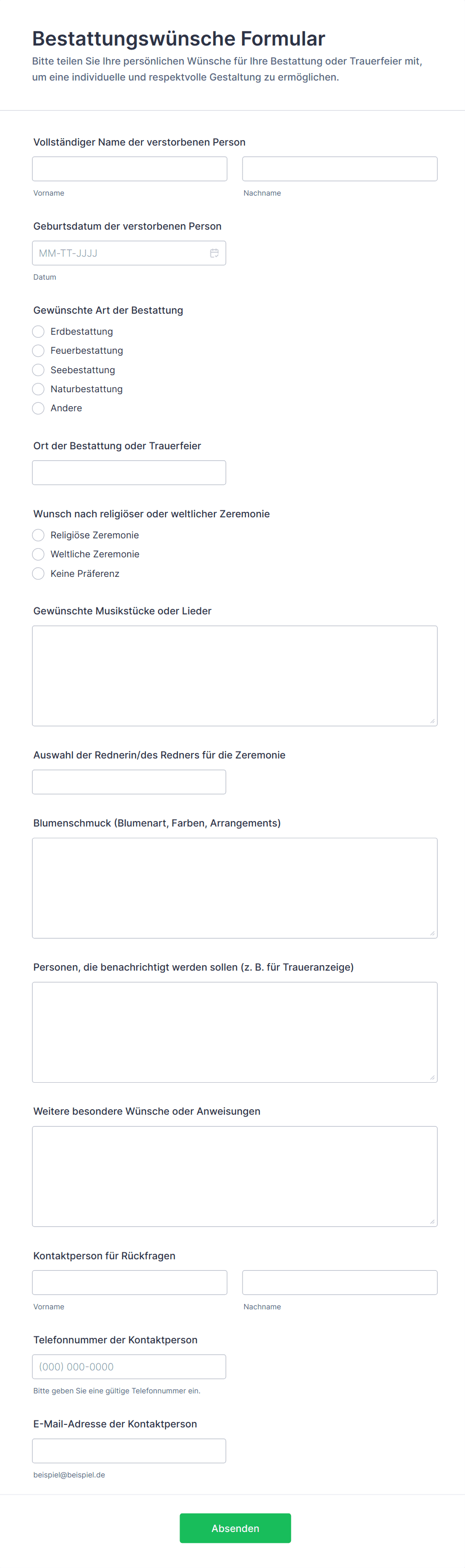 • Inhalt und Felder unterscheiden sich je nach Zielsetzung: So kann beispielsweise ein Fragebogen zur Gesundheitsvorsorge Angaben zur Krankengeschichte und Symptom-Checklisten enthalten, während ein Feedback Formular sich auf Zufriedenheitsbewertungen und offene Kommentare konzentriert.