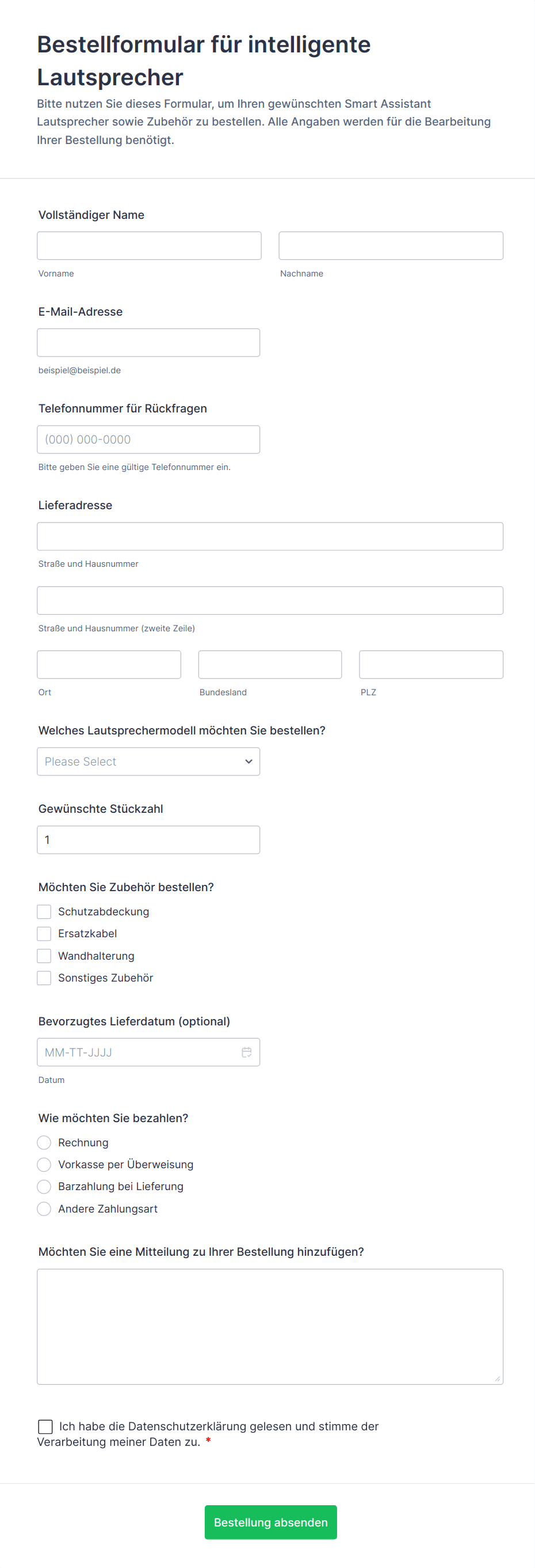 Typische Felder umfassen Kundenname, Kontaktinformationen, Produktauswahl, Menge, Zahlungsdetails und Lieferadresse (falls zutreffend).