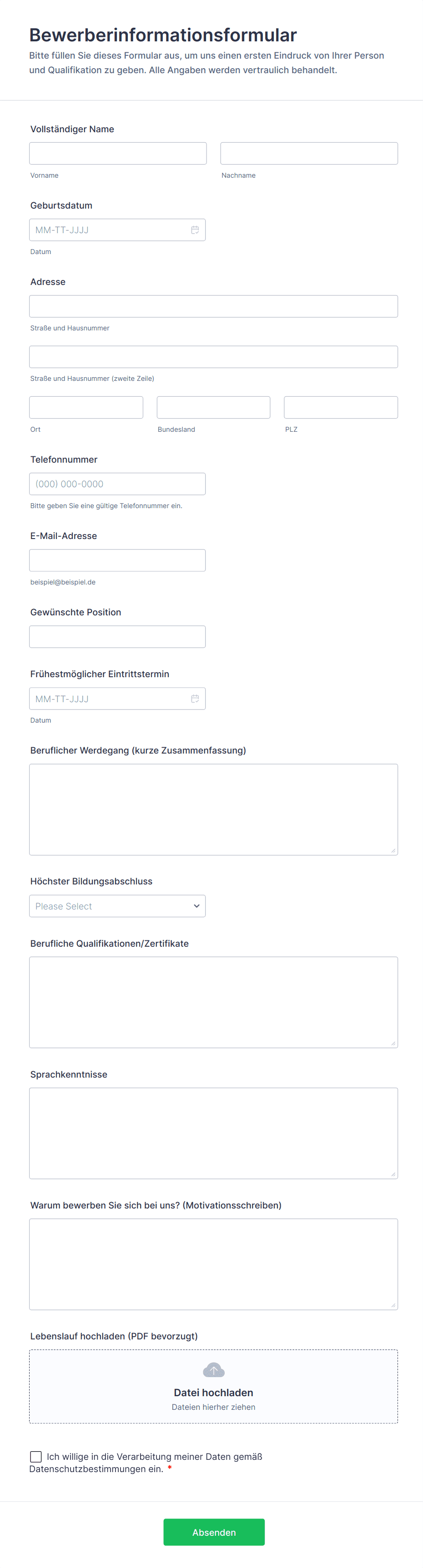 Zu den üblichen Feldern gehören Name, Kontaktdaten, gewünschte Position, Berufserfahrung, Ausbildung, Fähigkeiten und Referenzen. Manchmal sind auch Datei-Uploads für Lebensläufe oder Portfolios möglich.