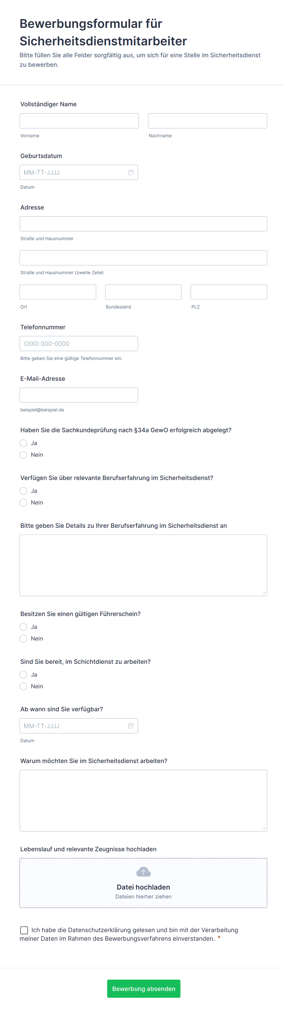 Zu den üblichen Feldern gehören Name, Kontaktdaten, gewünschte Position, Berufserfahrung, Ausbildung, Fähigkeiten und Referenzen. Manchmal sind auch Datei-Uploads für Lebensläufe oder Portfolios möglich.