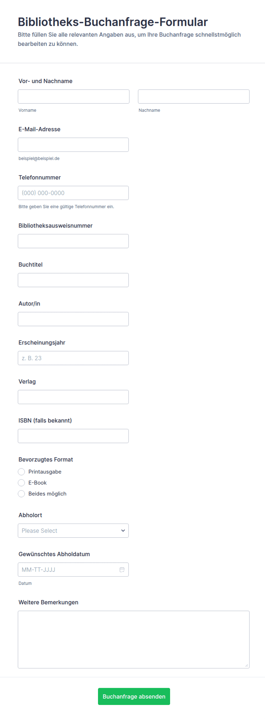 Ein Formular für Bibliotheken ist ein digitales Tool, mit dem Bibliotheken Informationen zum Bibliotheksbetrieb sammeln, verwalten und organisieren können. Mögliche Anwendungsbereiche sind beispielsweise Mitgliedschaftsanträge, Buchanfragen, Event-Anmeldungen und Feedback.