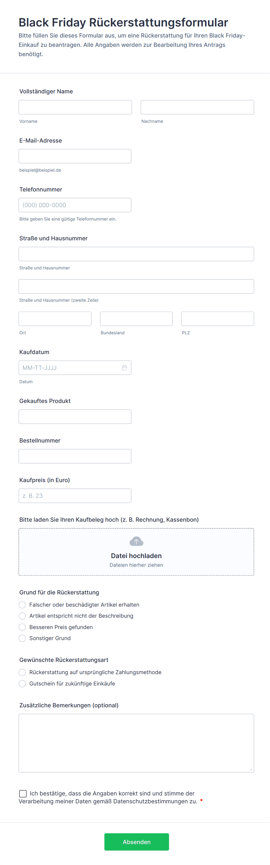 Eine Rückerstattungsformularvorlage ist ein vorgefertigtes Online-Formular, mit dem Unternehmen oder Organisationen Rückerstattungsanträge effizient erfassen und bearbeiten können. Es enthält Felder für wesentliche Informationen wie Bestelldetails, Grund für die Rückerstattung und unterstützende Dokumente.