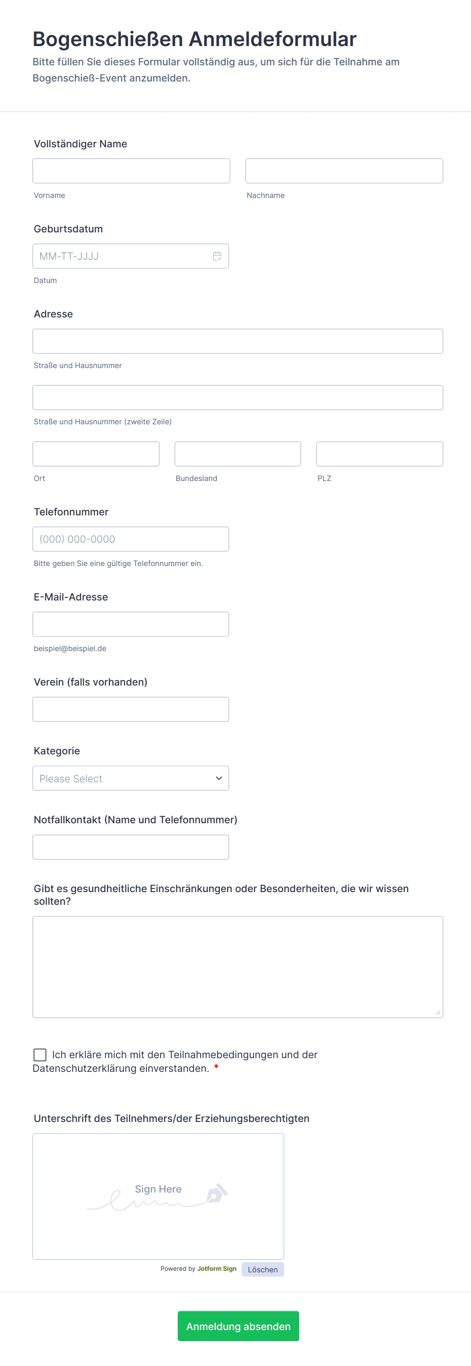 Sportanmeldeformulare sind wichtige Werkzeuge für die Organisation und Verwaltung der Teilnahme an sportlichen Aktivitäten, Ligen, Turnieren und Fitnessprogrammen. Diese Formulare werden von Sportvereinen, Schulen, Gemeindezentren und Veranstaltern verwendet, um wichtige Informationen von Athleten, Trainern und Freiwilligen zu erfassen. Typische Anwendungsfälle sind die Anmeldung von Spielern für Jugendfußballligen, die Registrierung von Teams für Basketballturniere, die Einschreibung von Teilnehmern in Fitness-Bootcamps und die Erfassung von Einverständniserklärungen und Notfallkontakten für schulische Sportveranstaltungen. Durch die Optimierung des Anmeldeprozesses helfen diese Formulare sicherzustellen, dass alle erforderlichen Daten – wie Teilnehmerdetails, medizinische Informationen, Haftungsausschlüsse und Zahlungen – effizient und sicher erfasst werden.