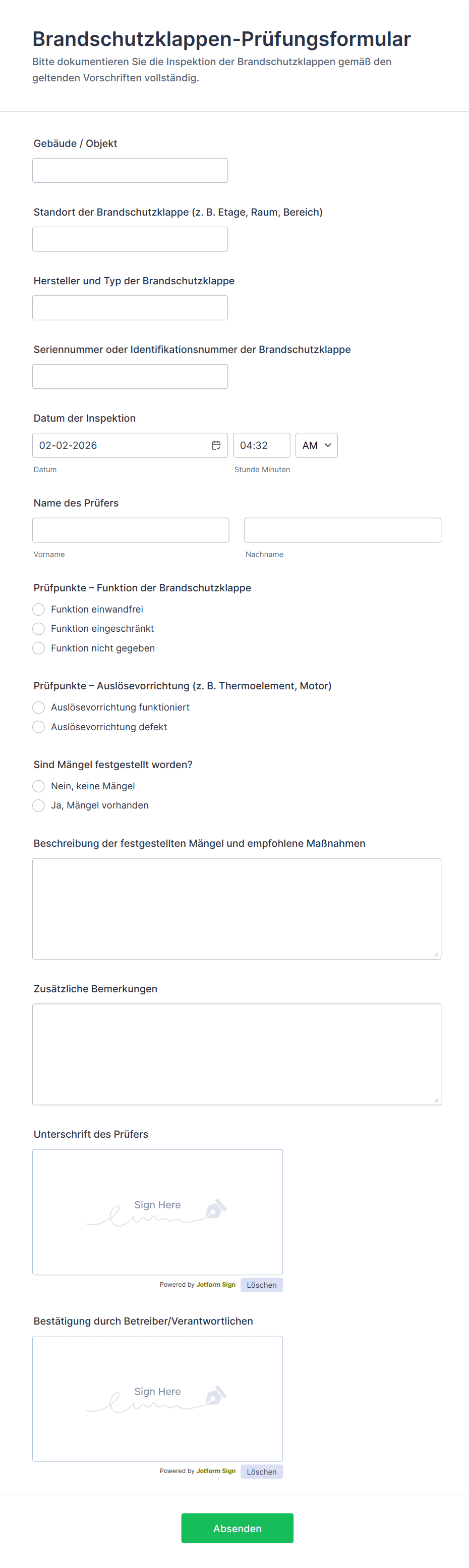 Mit Jotform können Nutzer den gesamten Prozess der Brandschutzbegehung optimieren, indem sie individuelle, digitale Formulare erstellen, die auf ihre spezifischen Anforderungen zugeschnitten sind. Der intuitive Formulargenerator von Jotform ermöglicht es, relevante Felder hinzuzufügen, Checklisten zu integrieren, Bilder hochzuladen und sogar digitale Signaturen zu sammeln — und das ganz ohne Programmierkenntnisse. Automatische Datenspeicherung, Benachrichtigungen in Echtzeit und die nahtlose Integration mit anderen Tools erleichtern die Verwaltung von Inspektionsaufzeichnungen, die Überwachung der Compliance und die Weitergabe von Berichten an die Beteiligten. Ganz gleich, ob Sie Brandschutzbeauftragter, Sicherheitsbeauftragter, Immobilienverwalter oder Mitglied eines Facility-Maintenance-Teams sind — mit Jotform können Sie gründliche Inspektionen effizient durchführen und übersichtliche, leicht zugängliche Aufzeichnungen führen.