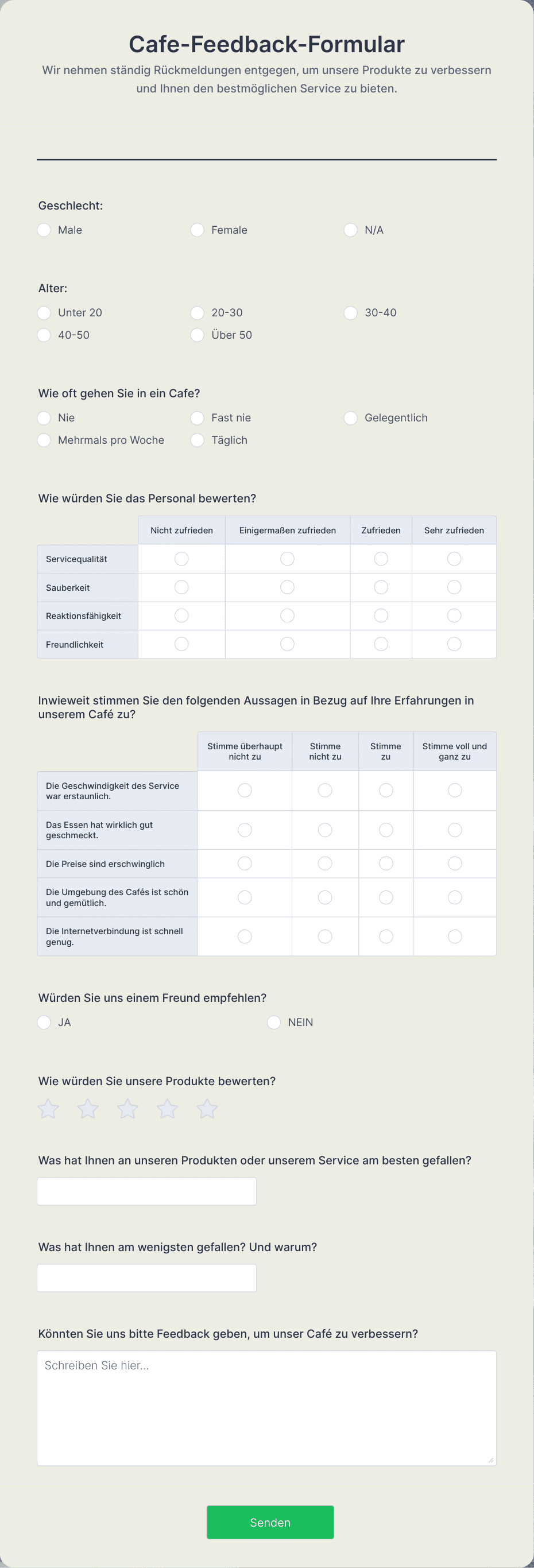 Ein Feedback-Formular ist eine Formvorlage, die es Unternehmen ermöglicht, wertvolles Feedback von Kunden zu sammeln und ihre Produkte und Dienstleistungen zu verbessern. Einfach anzupassen und zu verwenden, löst dieses Formulartemplate das Problem der effizienten Feedback-Sammlung.