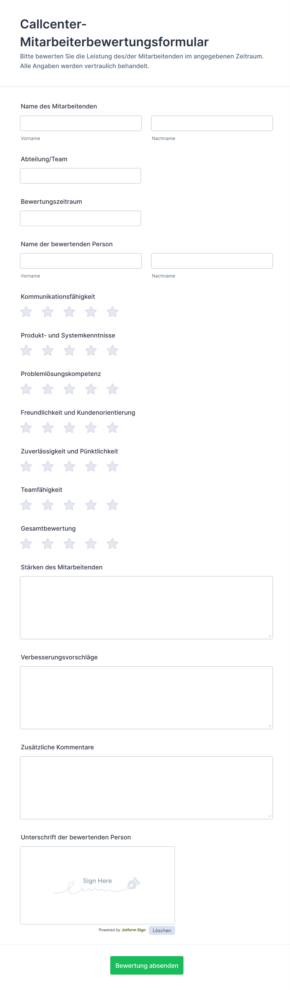 Ein Mitarbeiterbeurteilungsformular ist ein Instrument zur Leistungsbeurteilung, mit dem Sie die Fortschritte Ihrer Mitarbeiter verfolgen können, indem Sie Informationen über ihre Fähigkeiten, Ziele und Leistungen sammeln. Mit unseren kostenlosen Vorlagen für Mitarbeiterbeurteilungsformulare können Sie die Antworten online erfassen, um zu sehen, was Ihre Mitarbeiter gut machen und wo Verbesserungsbedarf besteht. Sobald Sie Ihre Mitarbeiterbeurteilungen auf Ihrem Computer oder mobilen Gerät erstellt haben, werden sie sicher in Ihrem Jotform-Konto gespeichert — so können Sie sie ganz einfach verwalten und in druckbare PDFs umwandeln!
