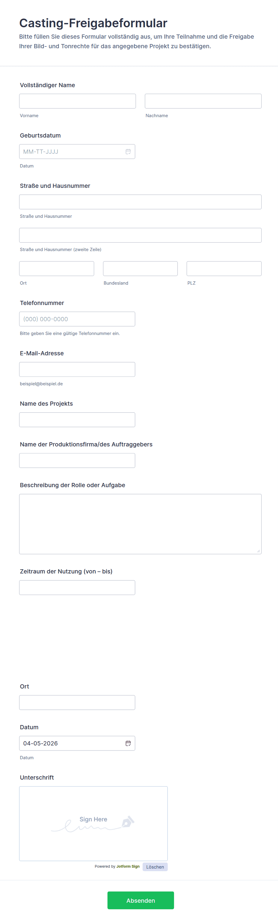 Einverständniserklärungen sind wichtige Dokumente, mit denen die ausdrückliche Zustimmung von Personen eingeholt wird, bevor Aktivitäten durchgeführt werden, die die Erfassung personenbezogener Daten, medizinische Verfahren, die Teilnahme an Forschungsprojekten, Fotoaufnahmen oder andere sensible Handlungen umfassen. Diese Formulare dienen als rechtliche und ethische Absicherung und stellen sicher, dass die Teilnehmer umfassend über ihre Verpflichtungen informiert sind und ihre Rechte gewahrt bleiben. Einverständniserklärungen werden häufig im Gesundheitswesen, im Bildungswesen, in der Forschung, im Veranstaltungsmanagement und in Unternehmen verwendet, in denen Transparenz und die Einhaltung von Vorschriften, wie beispielsweise der DSGVO oder HIPAA, von entscheidender Bedeutung sind.