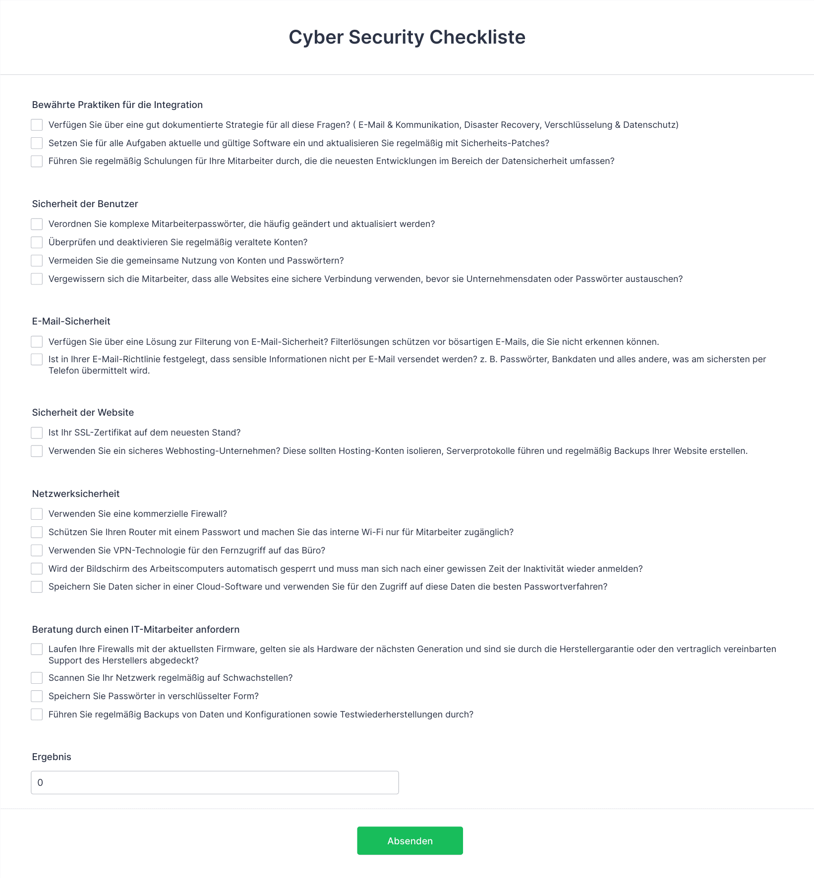 Eine Cybersecurity-Checkliste ist eine Liste von Maßnahmen, die dazu beitragen sollen, die Sicherheit der Daten eines Unternehmens zu gewährleisten. Wenn ein Unternehmen von einem Cyberangriff bedroht wird, ist eines der ersten Instrumente zur Ermittlung der Schwachstelle eine Cybersecurity-Checkliste. Eine Cybersecurity-Checkliste ist ein Dokument, das Best-Practice-Schritte oder eine Liste von Punkten enthält, die ein Unternehmen erfüllen muss, um seine Informationen und Vermögenswerte vor Sicherheitsbedrohungen zu schützen. Organisationen, die eine Cybersecurity-Checkliste verwenden, haben diese in der Regel in Form einer Richtlinie oder eines Verfahrenshandbuchs. Die Cybersecurity-Checkliste ist in der Regel ein Standard oder eine Vorlage, die an die Mitarbeiter verteilt wird. Die Mitarbeiter füllen dann die Checkliste aus und legen sie den leitenden Angestellten zur Überprüfung vor. Mit einer kostenlosen Cybersecurity-Checkliste können Sie Ihre persönlichen oder geschäftlichen Daten vor Cyberangriffen schützen und sicherstellen, dass Sie nicht gehackt werden. Fügen Sie Fragen hinzu, ändern Sie das Hintergrundbild, ordnen Sie Formularfelder neu an - all das können Sie mit unserem kostenlosen Formulargenerator tun! Wenn Sie die gesammelten Informationen in Ihren anderen Konten speichern, in ein CRM-System wie Salesforce (auch auf Salesforce AppExchange verfügbar) oder HubSpot integrieren oder das Formular einfach an Ihr Unternehmen anpassen möchten, stehen Ihnen unsere benutzerfreundlichen Anpassungstools zur Verfügung.