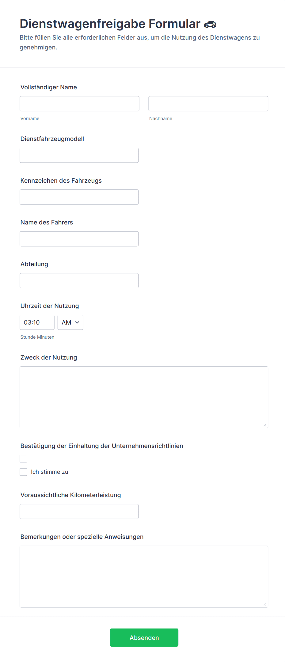 - Formulare für Wartung und Instandhaltung der Flotte fokussieren sich auf Fahrzeug-ID, Problemart, Schweregrad, Terminverfügbarkeit, Lieferantenpräferenzen sowie Genehmigungs- oder Arbeitsauftrag-Details.