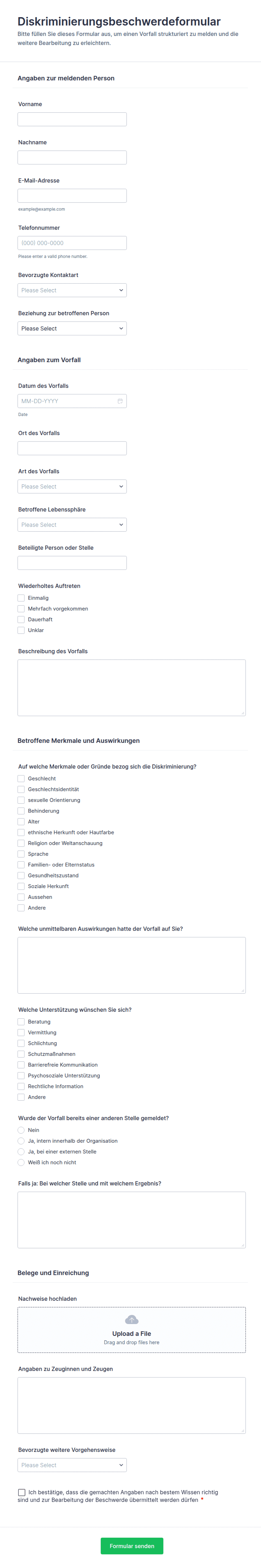 • Bedingte Logik: Bestimmte Felder werden nur angezeigt, wenn bestimmte Optionen ausgewählt werden (z. B. Art der Beschwerde).