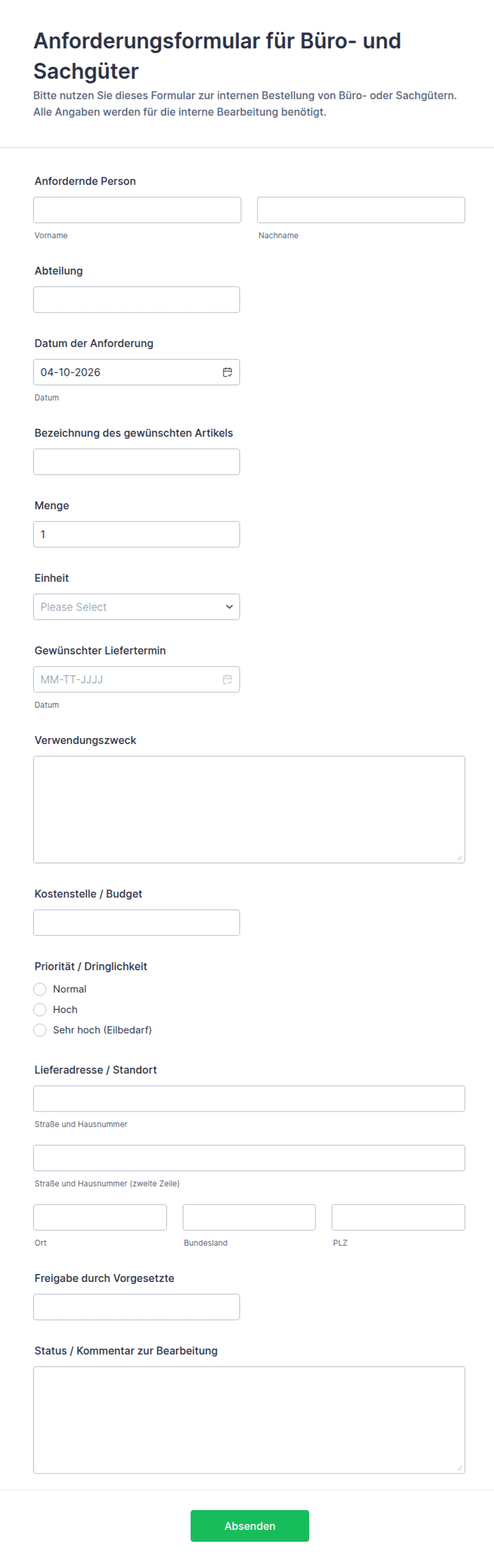 Zu den üblichen Feldern gehören Angaben zum Anforderer, Artikelbeschreibungen, Mengen, Lieferadressen, Genehmigungsabschnitte und manchmal auch Zahlungs- oder Lieferanteninformationen.