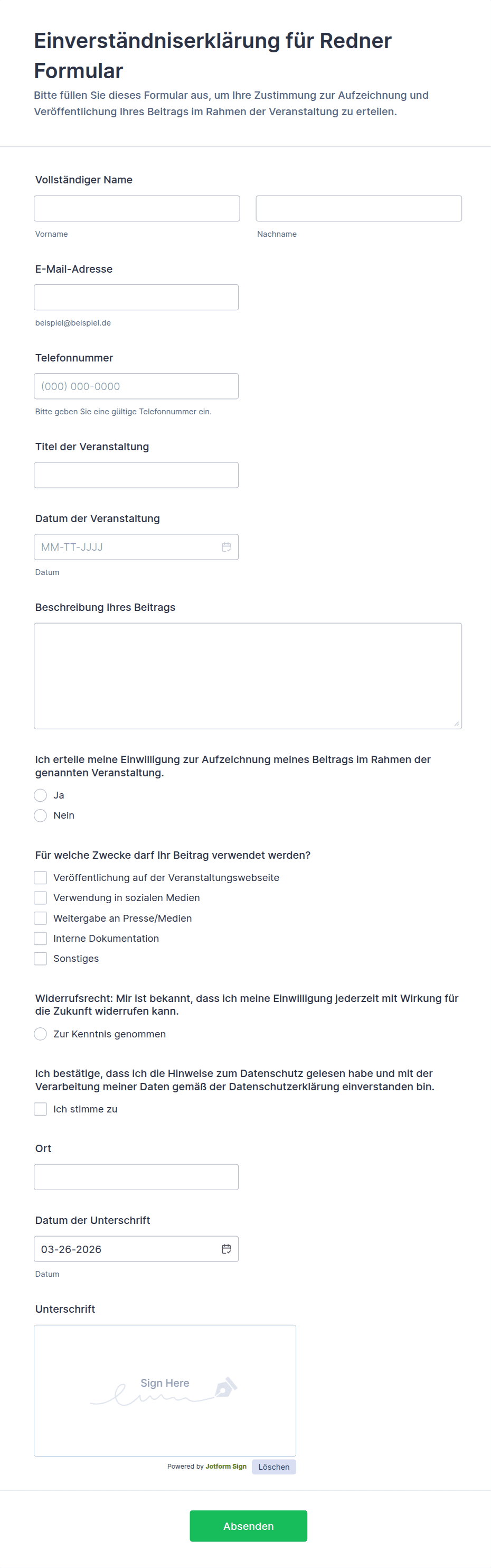 Erfassen Sie Einwilligungen von Rednerinnen und Rednern für Aufzeichnung und Nutzung von Beiträgen bei Veranstaltungen mit einer anpassbaren Formularvorlage aus den Jotform Formularvorlagen.
