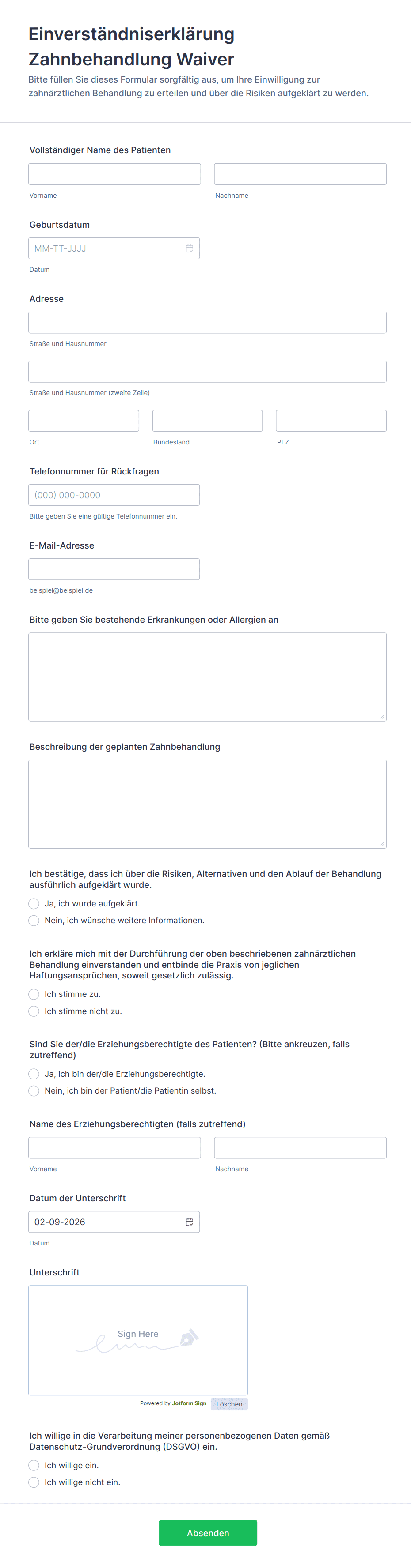 Jotform optimiert den gesamten Ablauf für Einwilligungserklärungen bei Zahnbehandlungen — von der Erstellung über die Verteilung bis zur Verwaltung. Mit dem No-Code Formulargenerator passen Sie Einwilligungen schnell an verschiedene Behandlungsverfahren und Praxisanforderungen an, fügen Felder für digitale Signaturen hinzu und integrieren sie direkt in Ihr Patientenverwaltungssystem. Dank der Drag-and-Drop-Oberfläche, vorgefertigter Vorlagen und sicherer Datenverarbeitung erfassen und speichern Sie Patienteneinwilligungen effizient. Die Digitalisierung verbessert das Patientenerlebnis, reduziert den Papierkram und stellt die Einhaltung gesetzlicher sowie behördlicher Vorgaben sicher.