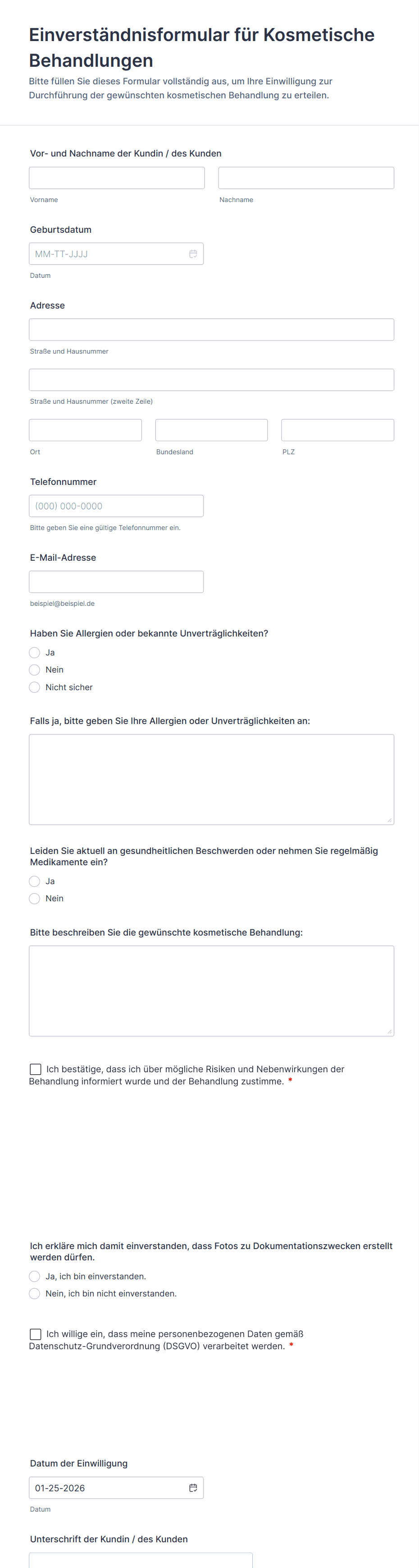 - Für medizinische oder Forschungsformulare sollten Abschnitte für bestimmte Verfahren, Widerrufsrechte und Datenschutzhinweise enthalten sein.
