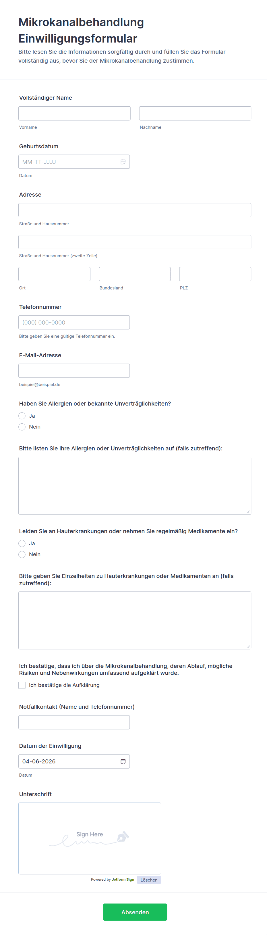 - Felder für die E-Signatur des Patienten und, falls erforderlich, des Erziehungsberechtigten oder Zeugen
