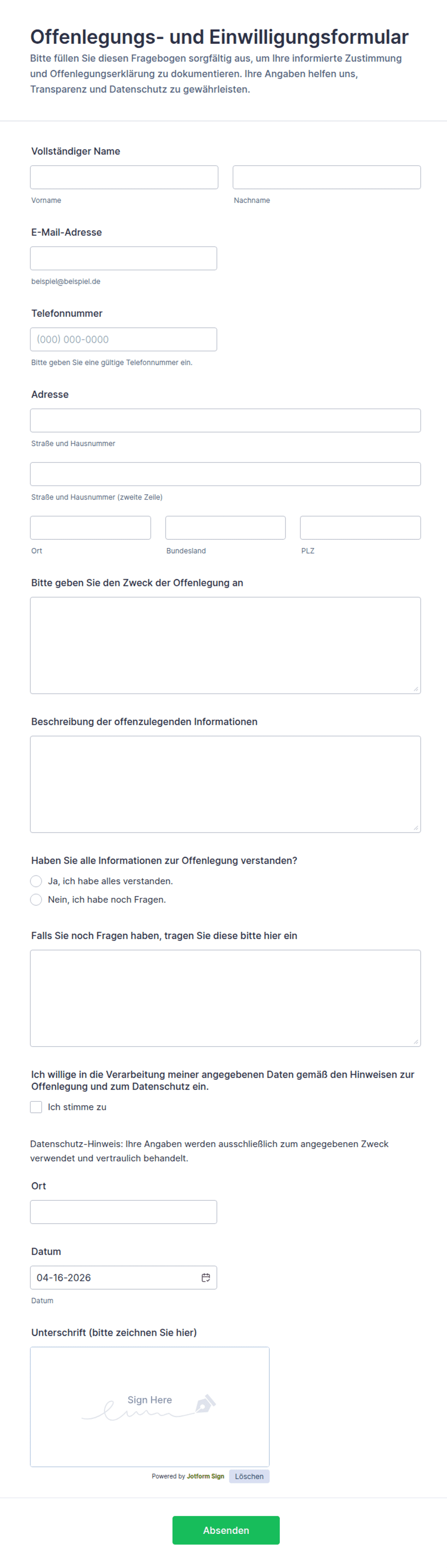 Einverständniserklärungen sind wichtige Dokumente, mit denen die ausdrückliche Zustimmung von Personen eingeholt wird, bevor Aktivitäten durchgeführt werden, die die Erfassung personenbezogener Daten, medizinische Verfahren, die Teilnahme an Forschungsprojekten, Fotoaufnahmen oder andere sensible Handlungen umfassen. Diese Formulare dienen als rechtliche und ethische Absicherung und stellen sicher, dass die Teilnehmer umfassend über ihre Verpflichtungen informiert sind und ihre Rechte gewahrt bleiben. Einverständniserklärungen werden häufig im Gesundheitswesen, im Bildungswesen, in der Forschung, im Veranstaltungsmanagement und in Unternehmen verwendet, in denen Transparenz und die Einhaltung von Vorschriften, wie beispielsweise der DSGVO oder HIPAA, von entscheidender Bedeutung sind.