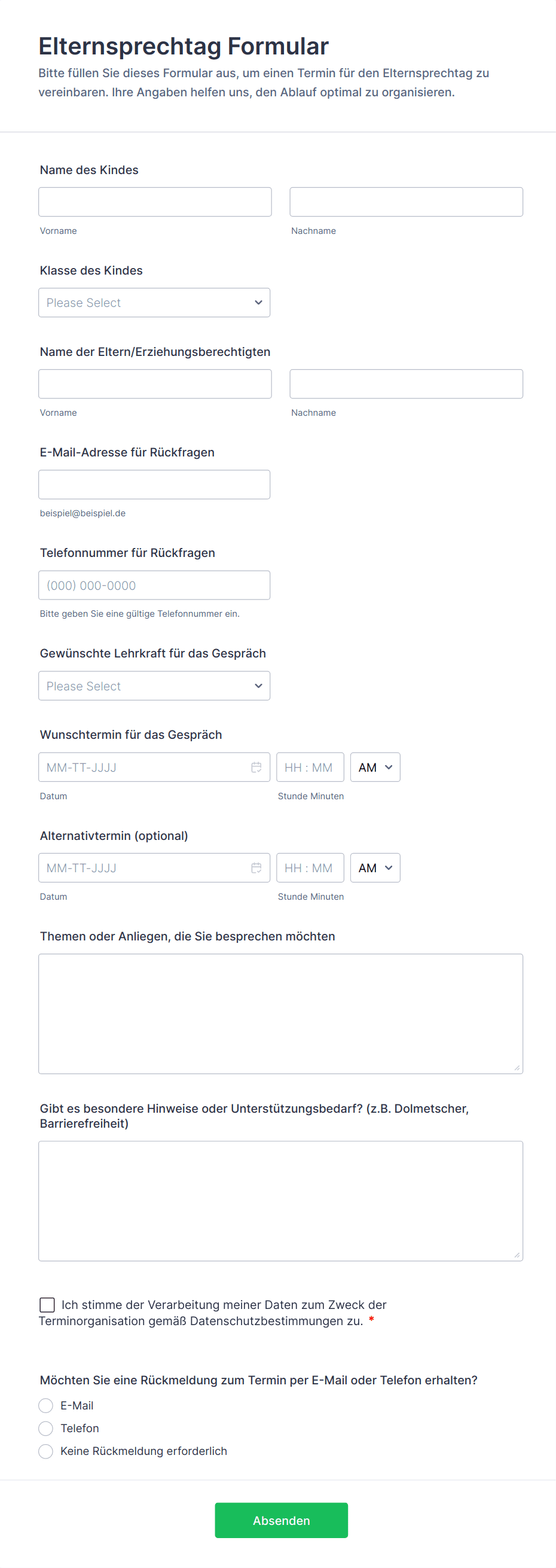 Ein Formular für Elternsprechstunden ist ein digitales oder gedrucktes Dokument, das zur Planung, Organisation und Protokollierung von Treffen zwischen Eltern und Lehrkräften verwendet wird, um eine klare Kommunikation über die Fortschritte und Bedürfnisse eines Schülers zu gewährleisten.