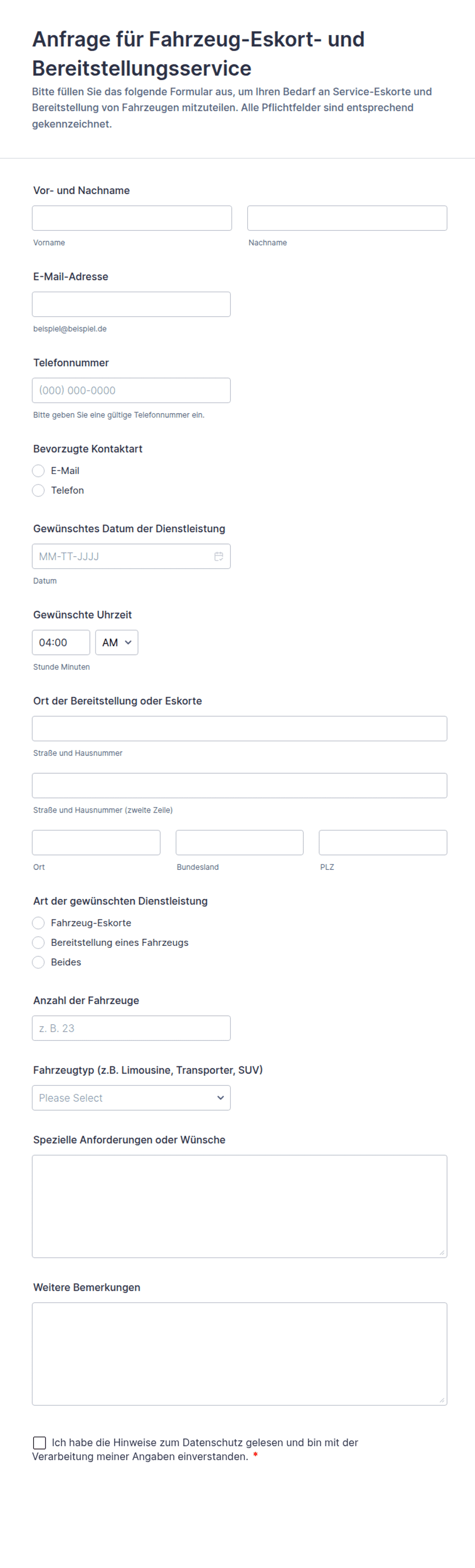 - Formulare für Wartung und Instandhaltung der Flotte fokussieren sich auf Fahrzeug-ID, Problemart, Schweregrad, Terminverfügbarkeit, Lieferantenpräferenzen sowie Genehmigungs- oder Arbeitsauftrag-Details.