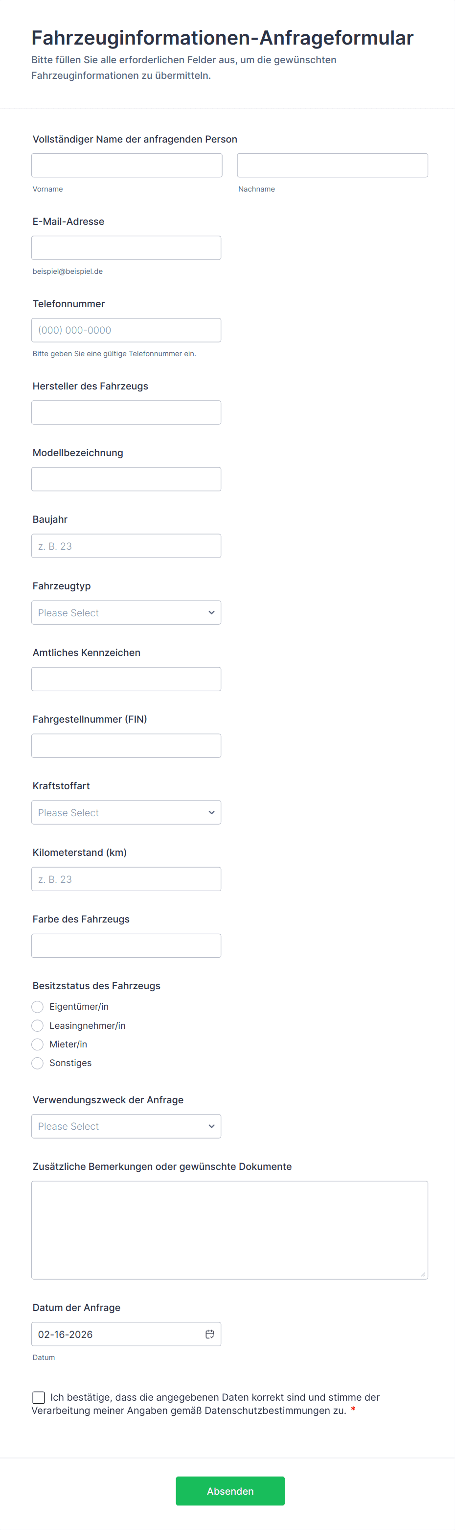 Erfassen Sie Fahrzeugdatenanfragen für Autohäuser, Werkstätten oder Fuhrparks mit dem Fahrzeuginformationen-Anfrageformular und bündeln Sie die Datenerfassung in einem Online-Formular über Jotform.