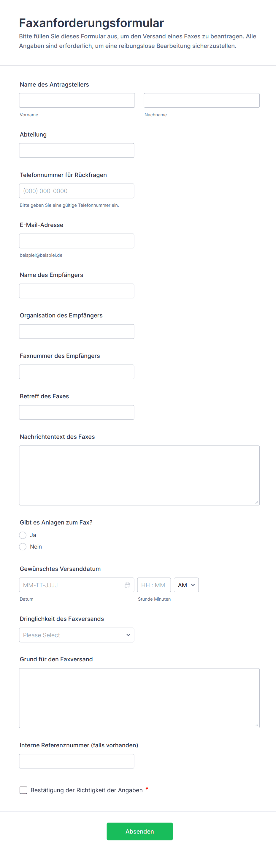 Anfrageformulare sind unverzichtbare Tools, um Informationen zu sammeln und zu organisieren, wenn jemand etwas benötigt — sei es eine Dienstleistung, eine Ressource, eine Genehmigung oder Support. Sie optimieren den Prozess der Einreichung und Verwaltung von Anfragen in einer Vielzahl von Szenarien, z. B. bei Geräteanfragen, Wartungsanfragen, Urlaubsanträgen, Anfragen an den IT-Support, Bestellaufträgen, Raumreservierungen und vielem mehr. Durch die Bereitstellung einer standardisierten Methode zur Erfassung aller erforderlichen Details tragen sie dazu bei, dass alle Anfragen klar, nachvollziehbar und umsetzbar sind. Dadurch werden Missverständnisse und Verzögerungen reduziert.