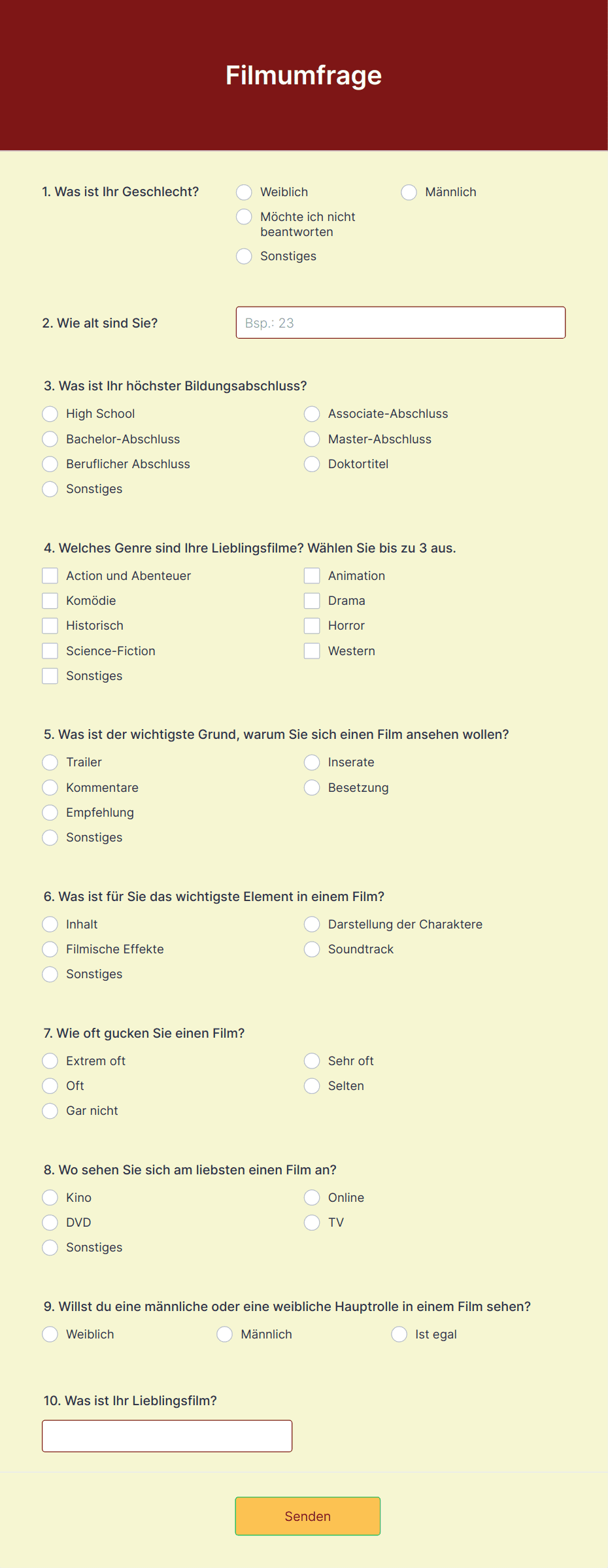 - Inhalt und Felder: Eine Kundenzufriedenheitsumfrage konzentriert sich möglicherweise auf Bewertungsskalen und offene Feedback-Fragen, während eine Marktforschungsumfrage demografische Fragen und Multiple-Choice-Optionen enthalten könnte. Mitarbeiterbefragungen erfordern oft Anonymität und verwenden häufig Likert-Skalen, während Veranstaltungsfeedback-Formulare Fragen zur Logistik und Qualität der Redner beinhalten könnten.