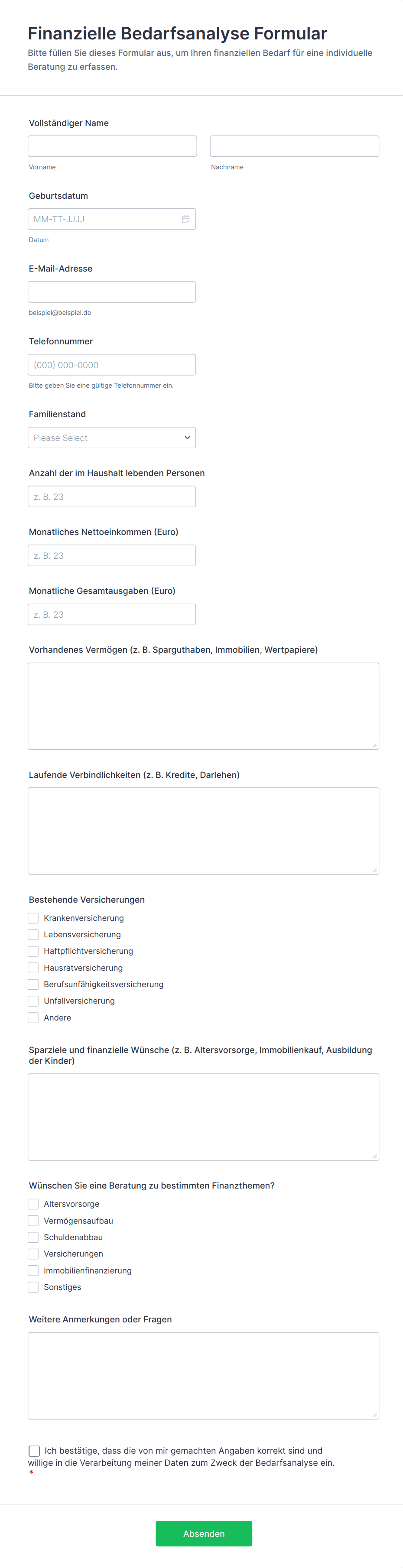 Ein Finanzberatungsformular ist ein digitales Dokument, das von Finanzexperten verwendet wird, um Kundeninformationen, Risikoprofile, Anlagevorlieben und Compliance-Daten zu erfassen, zu organisieren und zu verwalten.