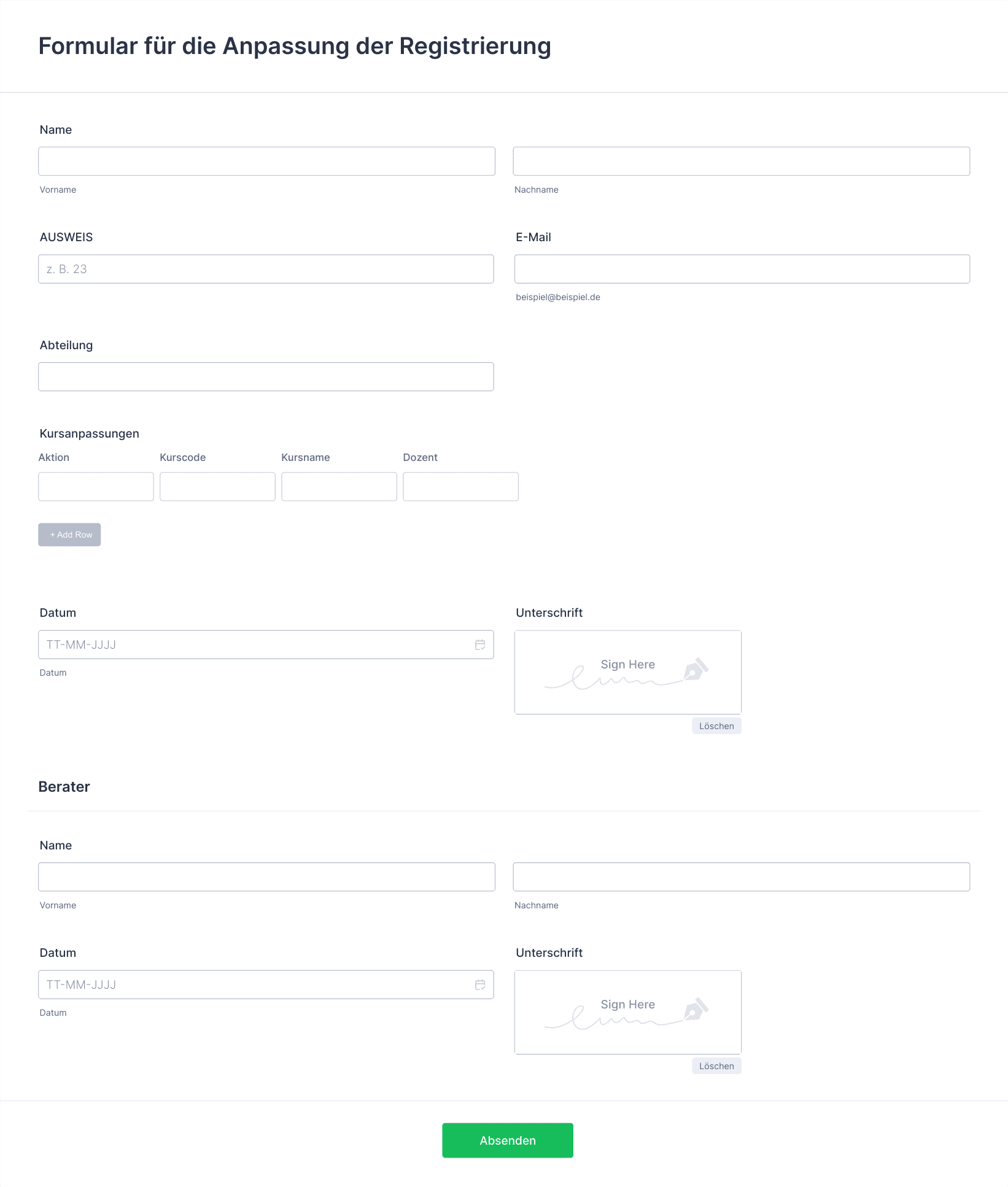 Registrierungsformulare sind unverzichtbare Tools zum Sammeln von Informationen von Personen, die sich für Veranstaltungen, Dienstleistungen, Mitgliedschaften, Kurse oder andere organisierte Aktivitäten anmelden möchten. Diese Formulare optimieren den Prozess der Erfassung von Teilnehmerdaten, Präferenzen und Einwilligungen und sind daher für Veranstalter, Bildungseinrichtungen, Vereine, Unternehmen und Non-profit-Organisationen unverzichtbar. Ganz gleich, ob Sie Anmeldungen für Konferenzen, Workshop-Teilnahmen, Ehrenamtliche oder Neukunden verwalten – mit Registrierungsformularen stellen Sie sicher, dass Sie alle erforderlichen Daten strukturiert und effizient erfassen.
