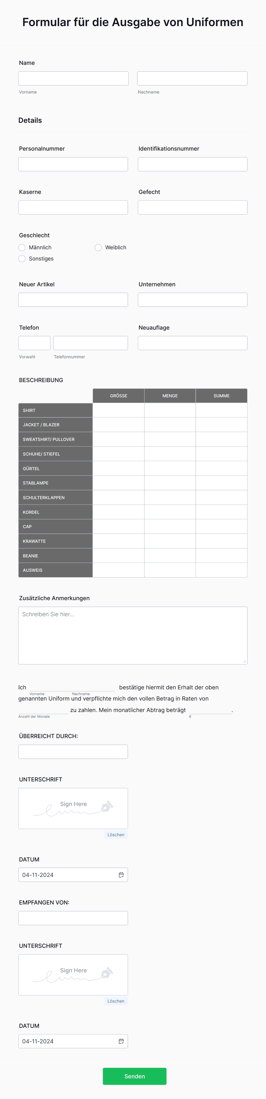 Ein Formular für die Übergabe von Dokumenten wird von Unternehmen verwendet, um wichtige Dokumente mit Kunden zu teilen und sie auf den Weg zu schicken. Egal, ob Sie eine Druckerei, ein Immobilienmakler, ein Fotostudio oder ein Notar sind, optimieren Sie Ihre Geschäftsprozesse mit unserem Formular für die Übergabe von Dokumenten – passen Sie einfach die Formularfelder an Ihr Unternehmen an, betten Sie das Formular auf Ihrer Website ein oder - Teilen Sie es mit einem Link und beobachten Sie, wie Kunden sofort ausgefüllte Formulare einreichen!