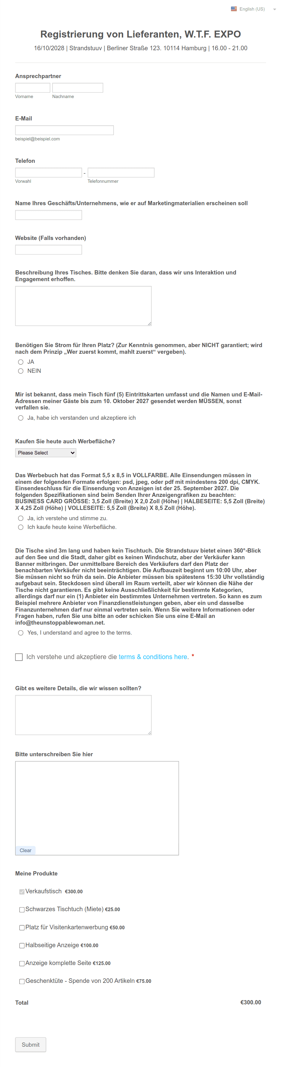 • Veranstaltungsbestellungen: Formulare könnten Ticketarten, Teilnehmerinformationen und Optionen für Gruppenbuchungen enthalten.