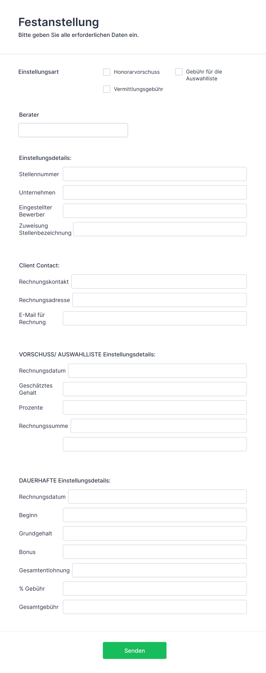 Ein Stellengesuch wird von Unternehmen und Organisationen für die Suche nach einem neuen Mitarbeiter verwendet. Notieren Sie Ihre Einstellungsanforderungen mit Hilfe eines Online-Stellengesuchsformulars - und teilen Sie es dann mit einem Link oder betten Sie es in Ihre Website ein! Sie können dieses Formular für Stellengesuche verwenden, um einen neuen Mitarbeiter für eine Einstiegsposition oder eine hochrangige Position zu finden. Das Formular enthält bereits vorgefertigte Felder für Gehalt, Stellenbezeichnung und Anforderungen an die Position, so dass Sie es an die zu besetzende Stelle anpassen können.   Unsere Vorlage für ein Stellengesuch kann Teil Ihres Bewerbungsprozesses sein - passen Sie das Formular einfach an die Stelle an, die Sie besetzen möchten. Wenn Sie Qualifikationen hinzufügen, einen Lebenslauf hochladen oder sogar ein Online-Quiz ausfüllen möchten, können Sie dies mit unserem Formulargenerator tun. Behalten Sie den Überblick über Ihre Suche, indem Sie jedes Gesuch als "angenommen", "abgelehnt" oder "ausstehend" markieren, damit Sie wissen, woran Sie sind. Wenn Sie Antworten automatisch an andere Konten senden möchten - z.B. an eine Speichersoftware - können Sie das mit den über 100 Integrationen von Jotform tun.