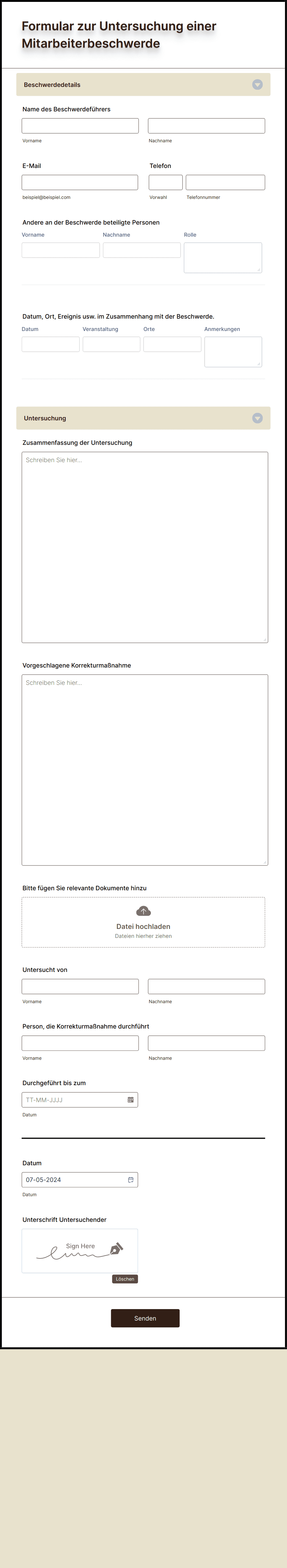Ein Formular für eine Gehaltserhöhung ist ein Dokument, das von dem Mitarbeiter ausgefüllt werden muss, der eine Gehaltserhöhung beantragt. Es ist wichtig, dass der Mitarbeiter den Prozess des Unternehmens befolgt, wenn er einen Antrag bei der Buchhaltung oder der Personalabteilung einreicht. Dieses Formular für eine Gehaltserhöhung enthält Formularfelder, die nach dem Namen, der Personalnummer, der Telefonnummer, der E-Mail-Adresse und der Position des Mitarbeiters fragen. Außerdem enthält es sensible Fragen wie den Beschäftigungsstatus, das aktuelle Gehalt, den beantragten Betrag für die Gehaltserhöhung und den Grund, warum der Mitarbeiter eine Gehaltserhöhung beantragt. Diese Formularvorlage verwendet das Tool Abschnitt einklappen, mit dem Sie Formularfelder vorübergehend ausblenden können, wobei der Nutzer auf die Leiste Abschnitt einklappen klicken muss, um die Felder zu sehen. Diese Formularvorlage verwendet auch das Werkzeug Unterschrift, um die digitale Unterschrift des Vorgesetzten zu erfassen, mit der er bestätigt, dass er den Antrag des Mitarbeiters auf eine Gehaltserhöhung unterstützt. Diese Vorlage kann weiter angepasst werden, indem Sie das Firmenlogo hinzufügen, die Schriftart ändern und das Farbthema ändern. Alle diese Änderungen können im Formulargenerator vorgenommen werden.