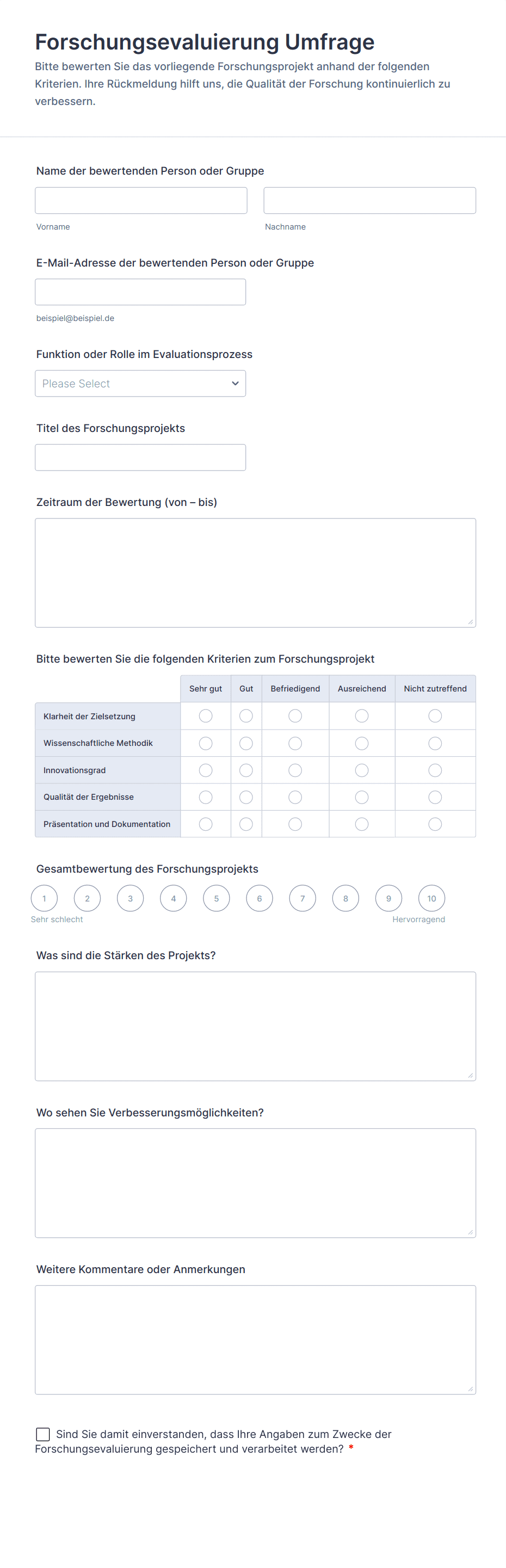Evaluierungsumfragen sind strukturierte Tools, mit denen Sie Feedback sammeln, die Zufriedenheit messen und die Effektivität von Programmen, Dienstleistungen, Veranstaltungen oder Produkten bewerten. Sie kommen in Bildung, Gesundheitswesen, Wirtschaft und im gemeinnützigen Bereich zum Einsatz, um wertvolle Erkenntnisse von Teilnehmern, Kunden, Mitarbeitern oder Stakeholdern zu gewinnen. Häufige Anwendungsfälle sind Kursbewertungen, Mitarbeiterleistungsbeurteilungen, Veranstaltungsfeedback, Kundenzufriedenheitsmessungen und Studien zur Programmauswirkung. Durch die systematische Erfassung und Analyse der Antworten können Sie Stärken identifizieren, Verbesserungsmöglichkeiten aufdecken und fundierte Entscheidungen zur Optimierung Ihres Angebots treffen.